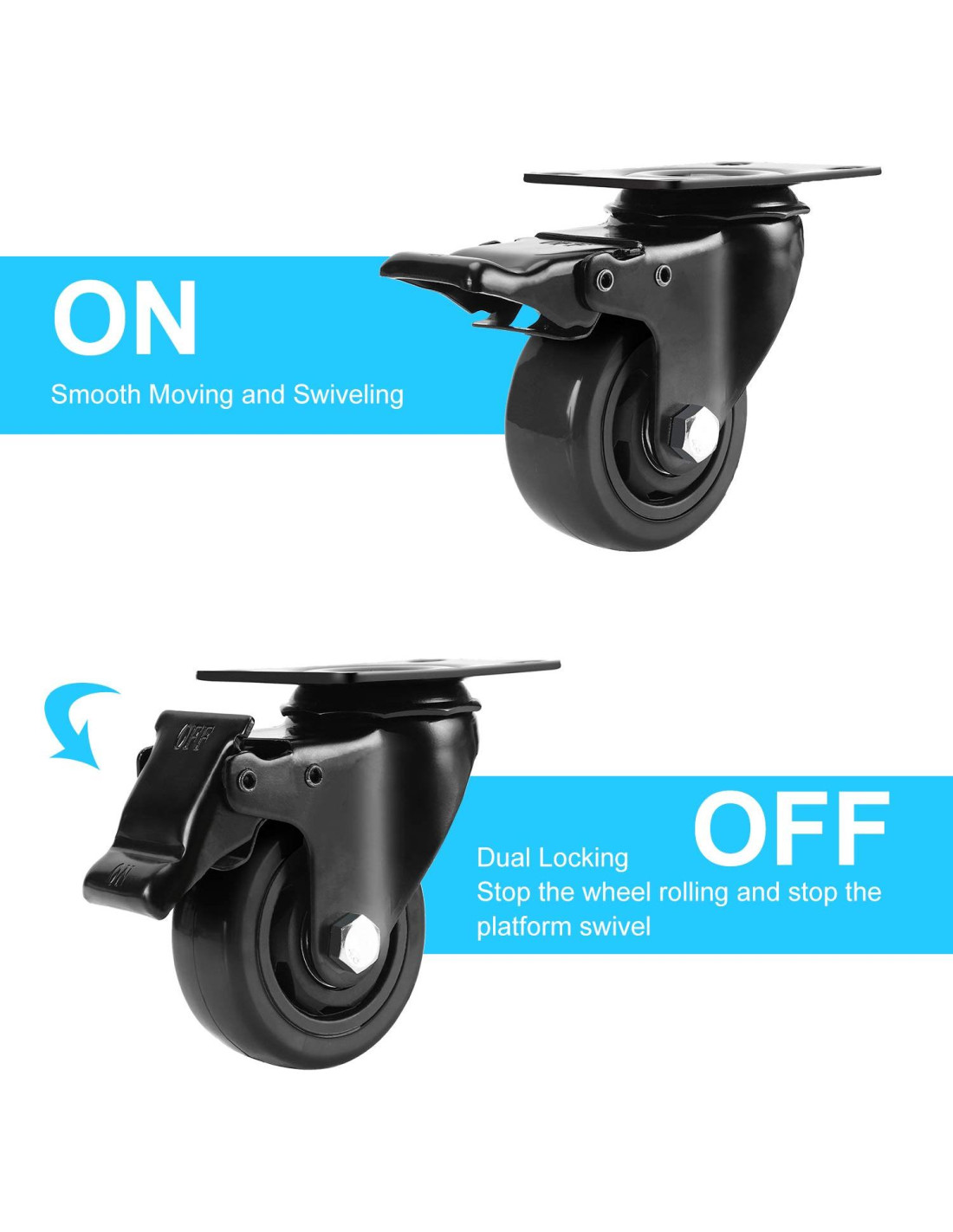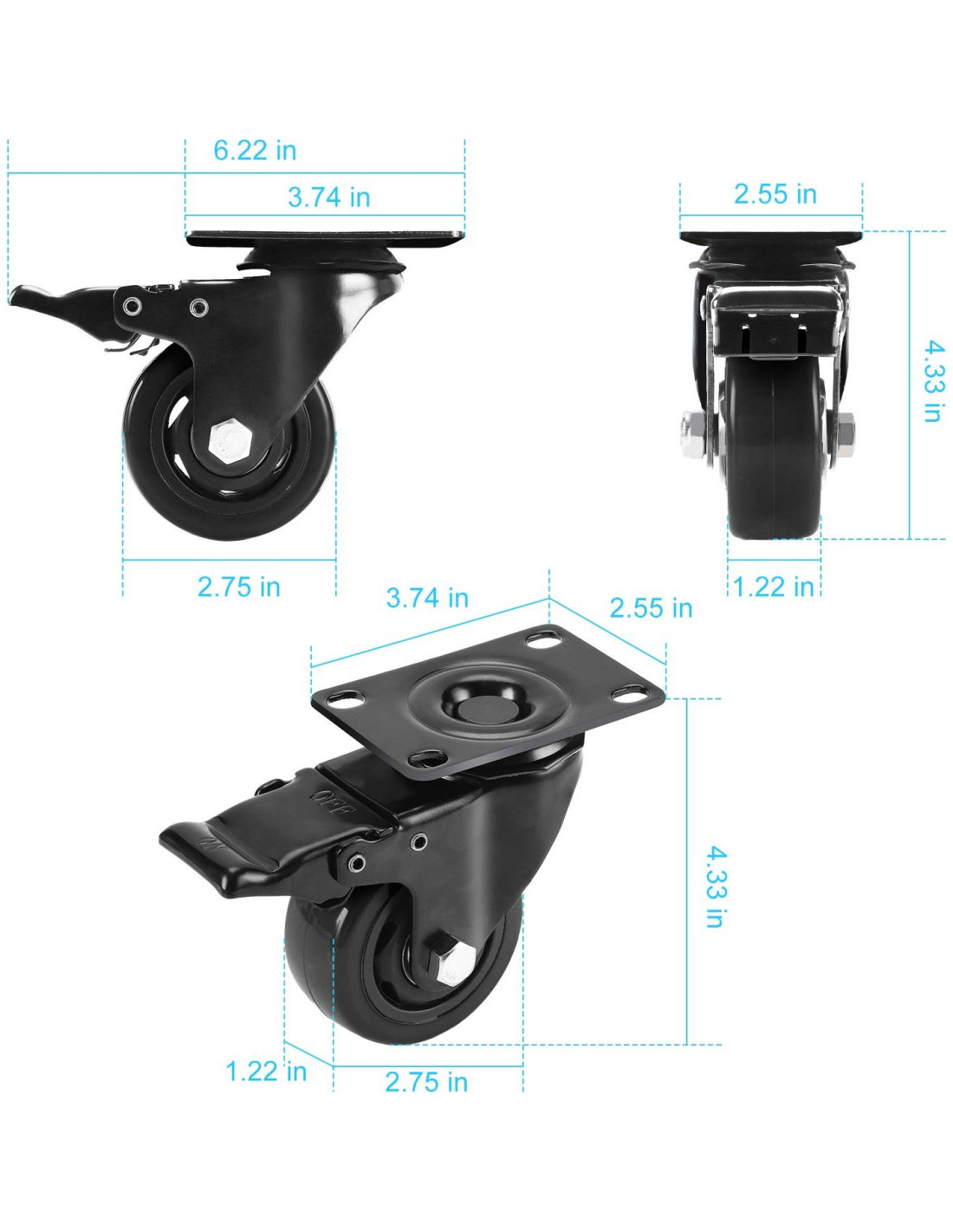 Características del producto: Ruedas de carro bloqueables -- El freno puede detener el movimiento de la rueda y la placa superior girando simultáneamente. -- Con freno, efectivo para detener y fijar el dispositivo y evitar que se mueva y lastime a otros. Ruedas giratorias de 360 grados y rodar suavemente -- Muy conveniente para transformarse en cualquier dirección, y gastar poca fuerza para moverse. Ruedas de goma silenciosas -- No te preocupes por molestar a otros al mover el equipo. -- No hay marcas al mover, y no lastima tu piso. Ruedas giratorias de uso amplio -- Perfectas para usar en casa, oficina o para dispositivos industriales. -- Como mesa de café, soporte para plantas, estanterías, zapateros, bins de juguetes, almacenamiento al lado de la cama, carritos de compras, banco de trabajo, remolque, estante de mercancías, y más. Parámetros del producto: Material del soporte: Acero de alta calidad Material de la rueda: Goma PVC Diámetro de la rueda: aproximadamente 2.75 pulgadas (6,99 cm) Ancho de la rueda: aproximadamente 1.22 pulgadas (3,10 cm) Altura total: aproximadamente 4.33 pulgadas (10,99 cm) Tamaño de la placa superior: aproximadamente 2.55 x 3.74 pulgadas (6,48 x 9,50 cm) Capacidad de carga: aproximadamente 1000lbs (453,59 kg) Contenido del paquete: 4 x Ruedas 16 x Tornillos Aviso: 1. Por favor, permite una ligera desviación en la medición de los datos. 2. No dudes en contactarnos si tienes alguna duda sobre nuestras ruedas, haremos nuestro mejor esfuerzo para resolver tus preguntas. Gracias de antemano.