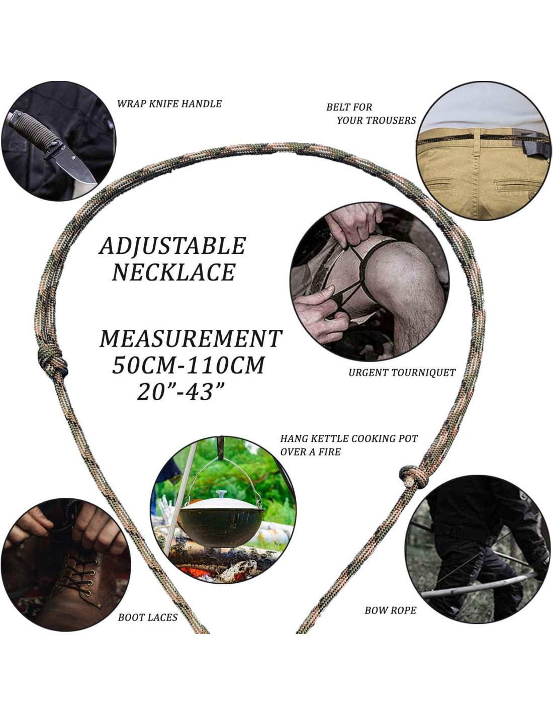 - [PARACORD DE GRADO MILITAR] Nuestro collar de Paracord para hombres y mujeres no solo es elegante y llamativo, sino también extremadamente cómodo y ligero. Manos libres, puede desarmarse a 110 cm de longitud y 550 lbs (250 kg). Puedes combinarlo fácilmente con cualquier atuendo y siempre tener un kit de encendedor de fuego de emergencia a tu disposición.