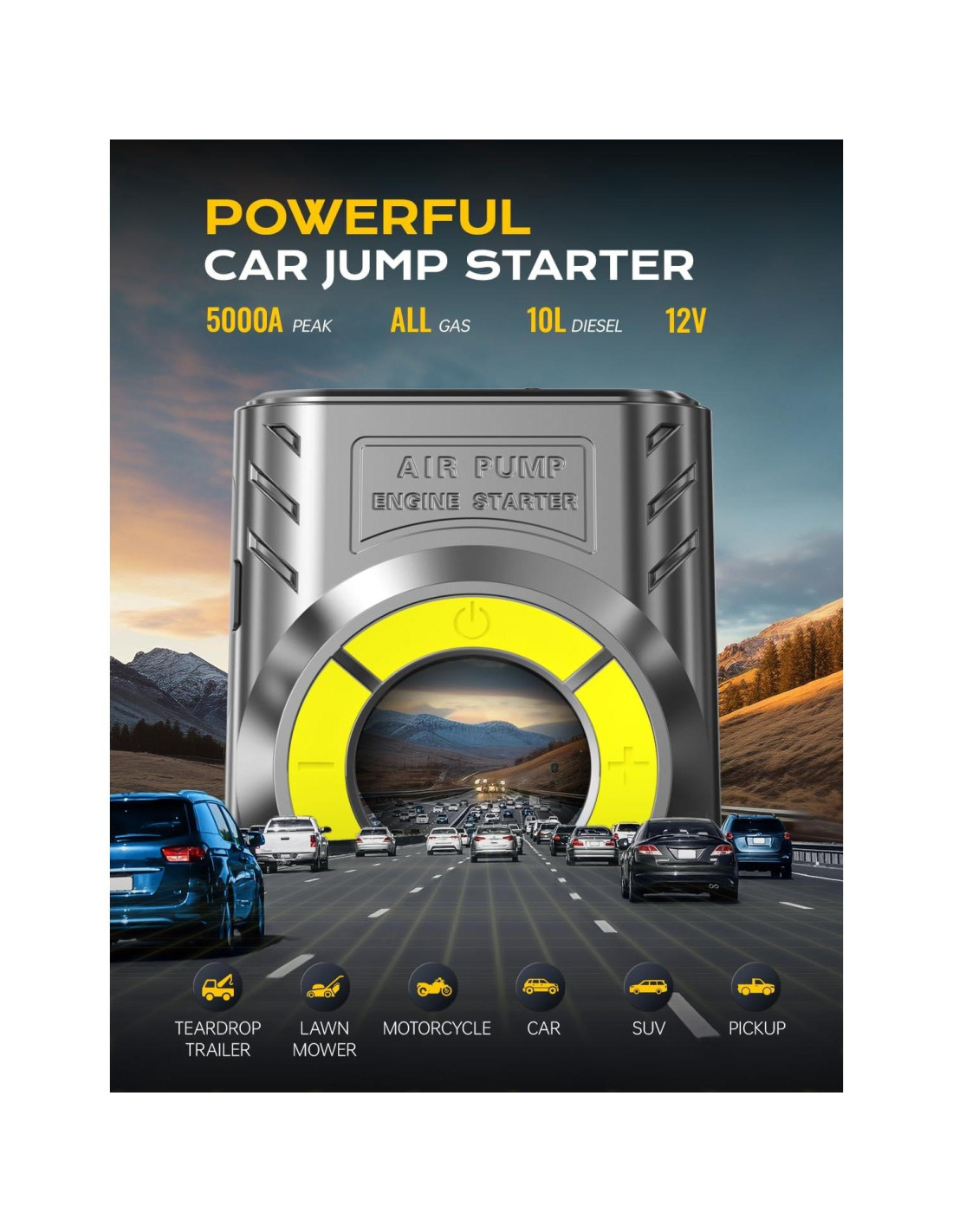 - [ARRANCADOR CON DISPOSITIVO AUTOINFLABLE] Los infladores de neumáticos de coche y los arrancadores de emergencia de vehículos son generalmente los 2 dispositivos eléctricos más comunes utilizados en coches, y nuestro paquete de batería de arranque tiene ambos. En situaciones cotidianas, solo toma de 5 a 8 minutos inflar completamente un neumático de coche de 190. (Basado en datos de prueba de un neumático estándar de 185/65/R15) Se puede usar para coches, bicicletas, motocicletas, balones de baloncesto, juguetes de piscina. No se admiten neumáticos de camiones de servicio pesado.