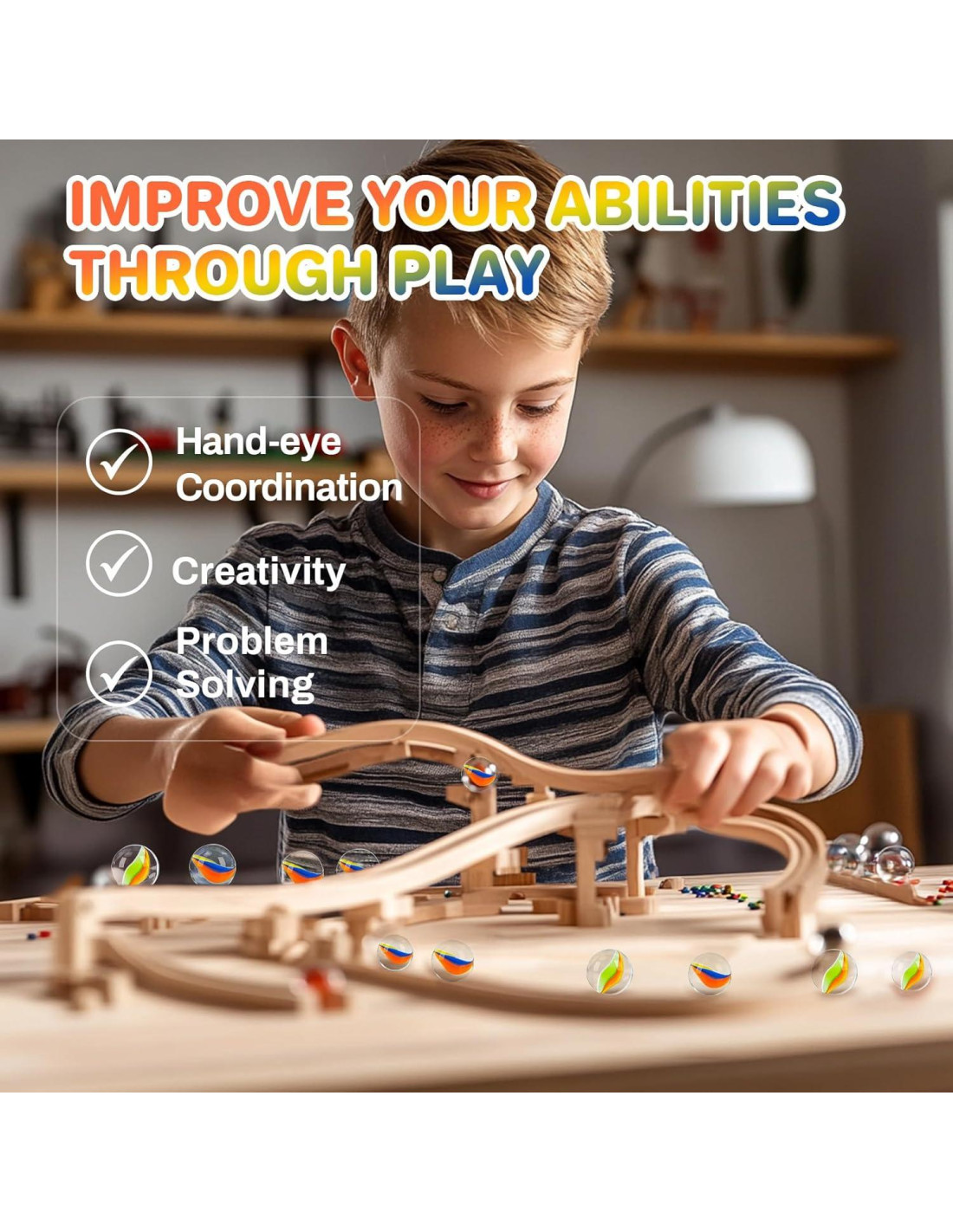 - Mejora: Jugar con canicas ayuda a mejorar la coordinación mano-ojo, las habilidades para resolver problemas y la creatividad. Mientras te diviertes, puedes planificar durante el juego para mejorar tus habilidades de pensamiento