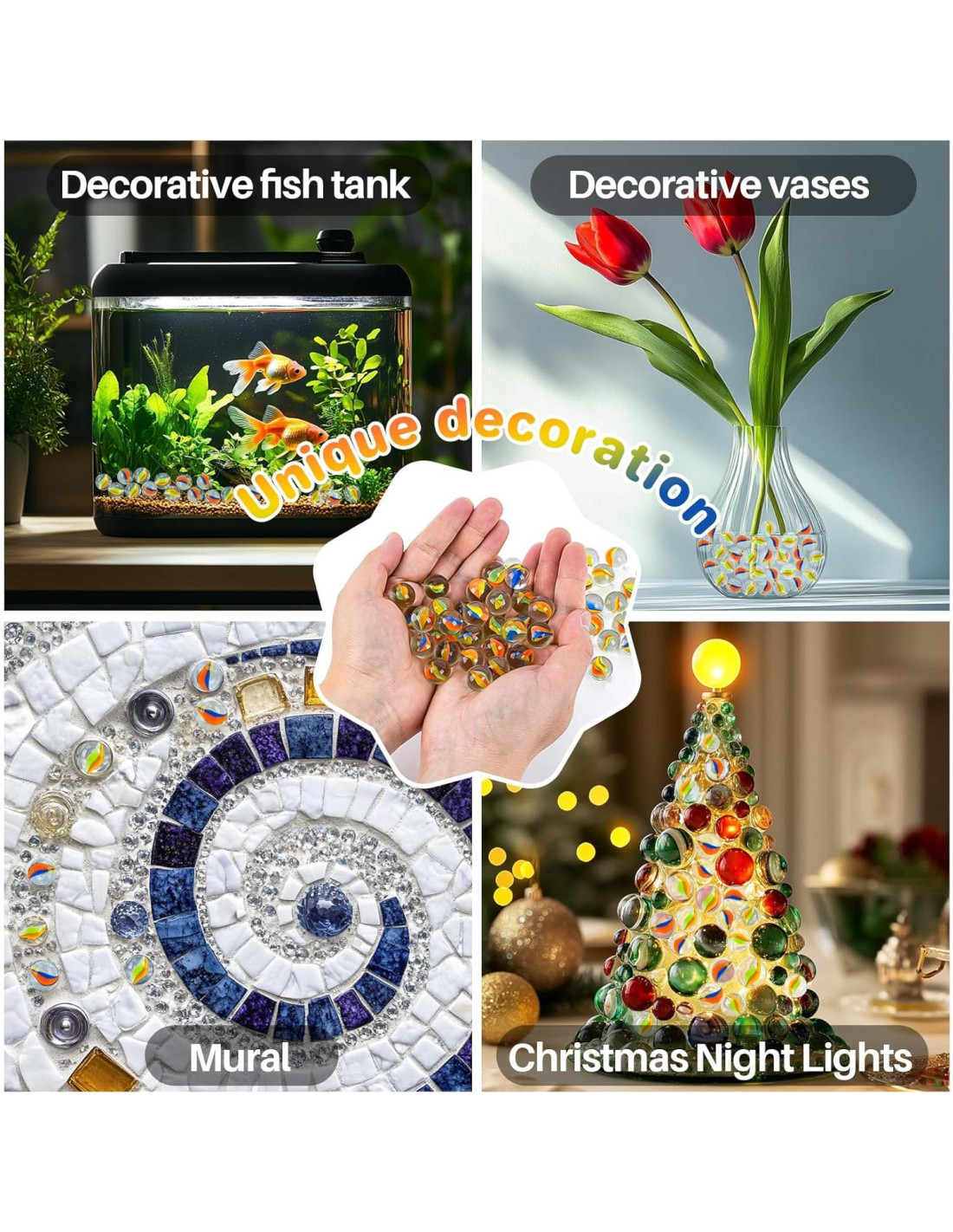 - Amplio Uso: Las canicas transparentes y suaves son perfectas para juegos multijugador como juegos de canicas, damas chinas y laberintos de canicas. Con colores ricos, también se pueden usar para decorar acuarios, jarrones o crear artesanías únicas, añadiendo colores vibrantes a tu vida