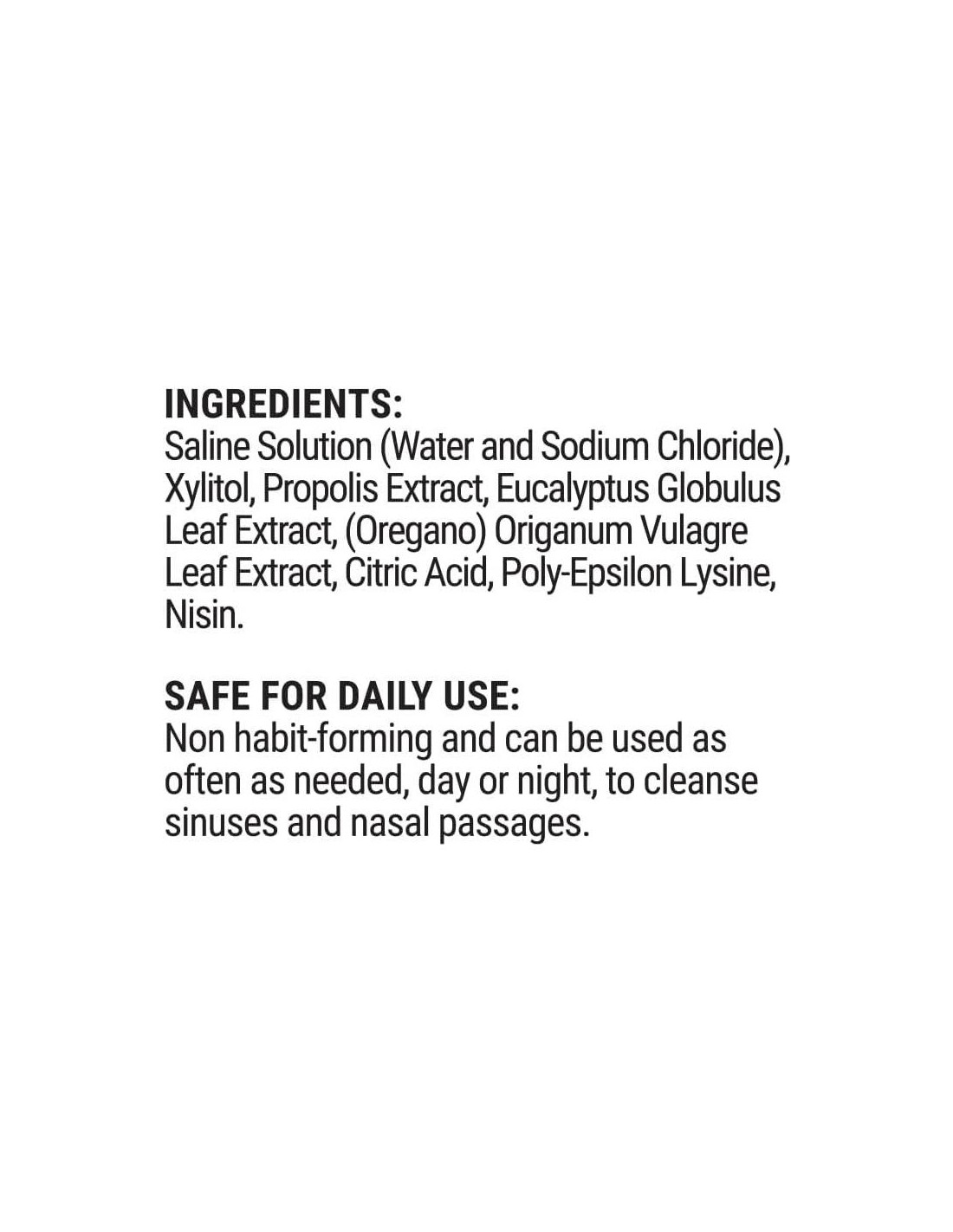 - POTENTE SPRAY NASAL DESCONGESTIONANTE A BASE DE HIERBAS PARA REVITALIZAR LOS SÍNUS: Cada spray ayuda a despejar la congestión nasal con una dosis potente de propóleos, aceite de orégano, eucalipto, xilitol y salina para que puedas respirar profundamente. Nuestro efectivo spray nasal expande el pasaje nasal para limpiar y despejar la congestión. Elimina los irritantes de los senos nasales como polen, contaminación, etc.
