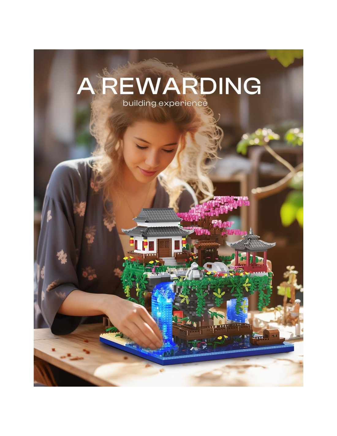 - Diseño Único: El exquisito conjunto de construcción de árbol de flores de cerezo tiene una forma única con la isla suspendida en el aire y sostenida por una cascada. La isla flotante contiene un palacio rodeado de hermosas plantas y flores. El diseño general tiene un fuerte estilo arquitectónico japonés, y el modelo de construcción con cuerdas de luz es más realista. Te sorprenderás cuando lo termines.