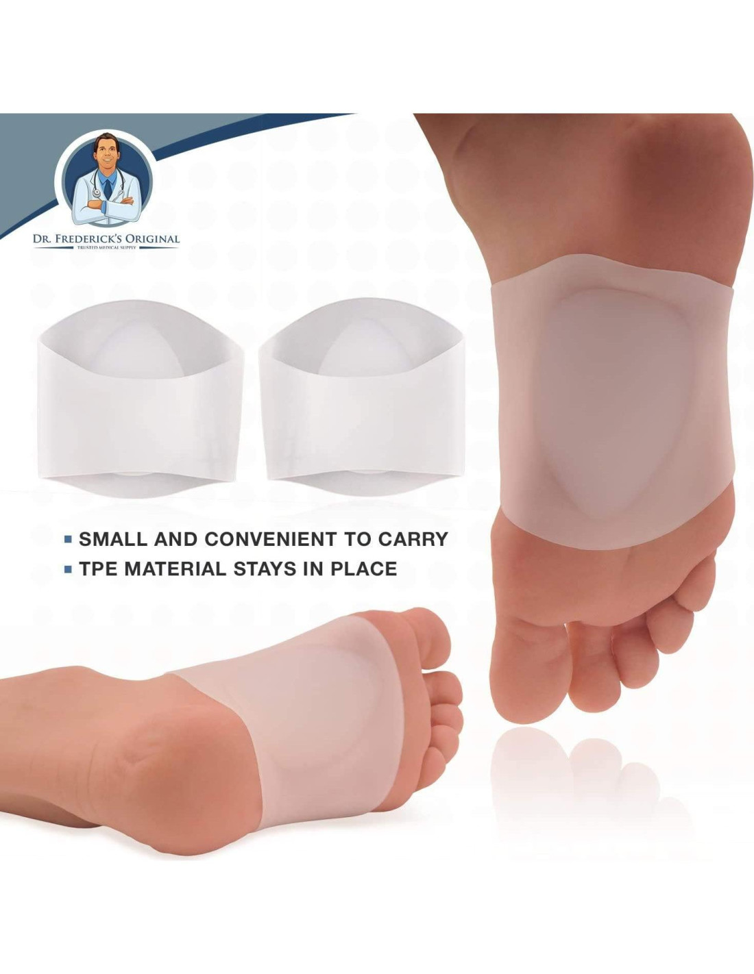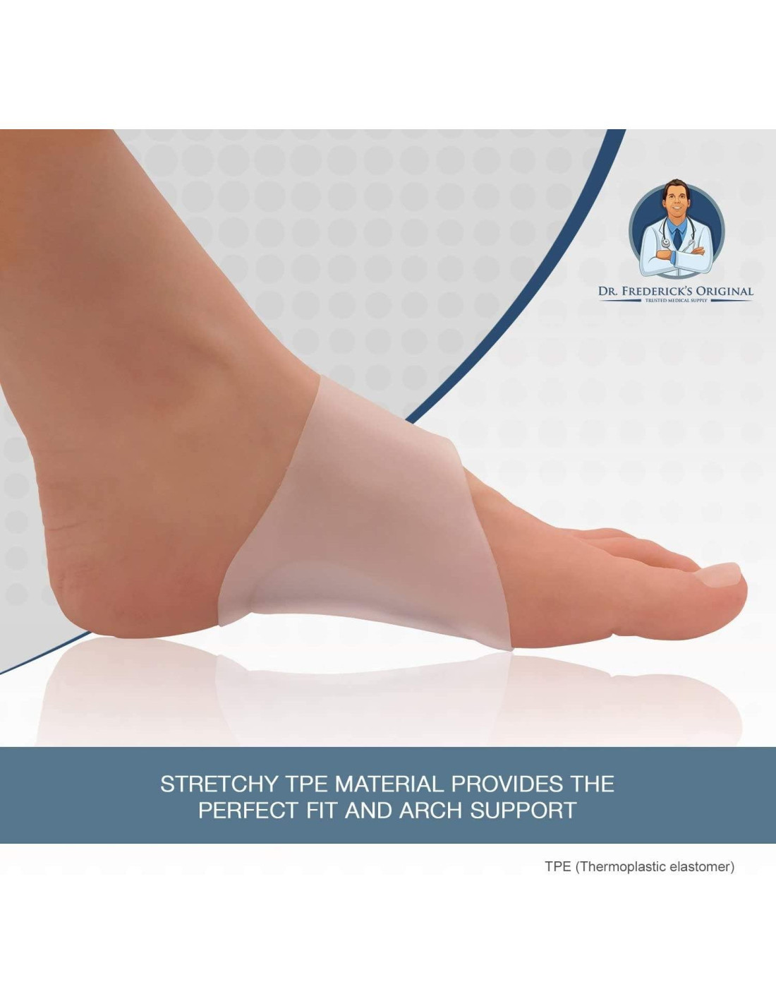 - FLEXIBLE, CÓMODO, EFECTIVO - Mientras que otras mangas de soporte de arco pueden ser demasiado ajustadas, demasiado sueltas o no lo suficientemente soportivas, las almohadillas de gel originales de Dr. Frederick se estiran para adaptarse a tus pies y se mantienen en su lugar con un calcetín ajustado, para brindarte un alivio duradero del dolor en los pies y talones que viene con pies planos y fascitis plantar.
