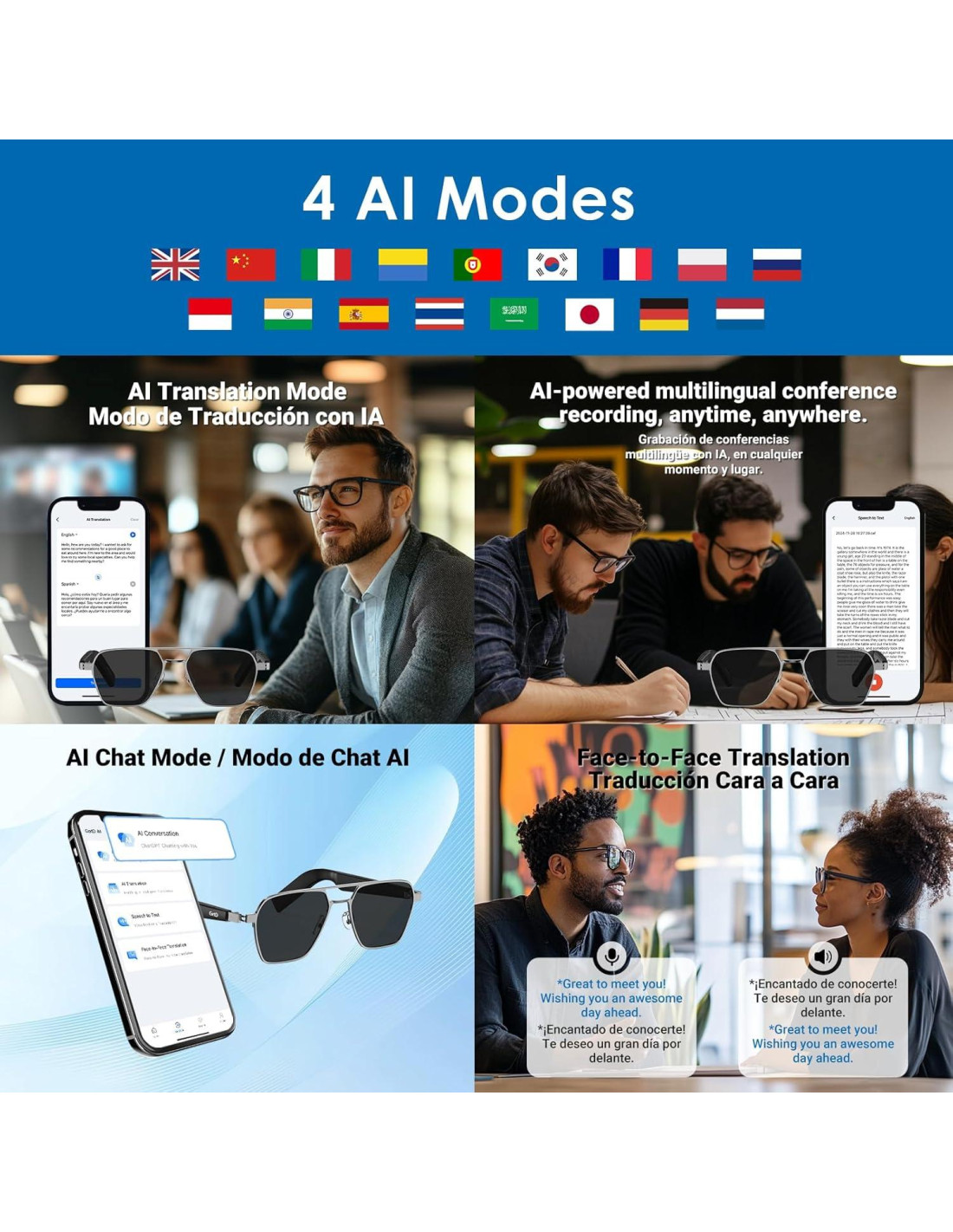 - [Gafas Inteligentes de Traducción AI] : Las gafas inteligentes GetD son perfectas para viajes transfronterizos, cuentan con la aplicación GetD Smart con cuatro modos de traducción: diálogo AI (con ChatGPT), traducción AI multilingüe, voz a texto y traducción cara a cara. Soportando 17 idiomas, cubren Europa, América, Asia y América Latina, asegurando una comunicación fluida durante tus viajes.