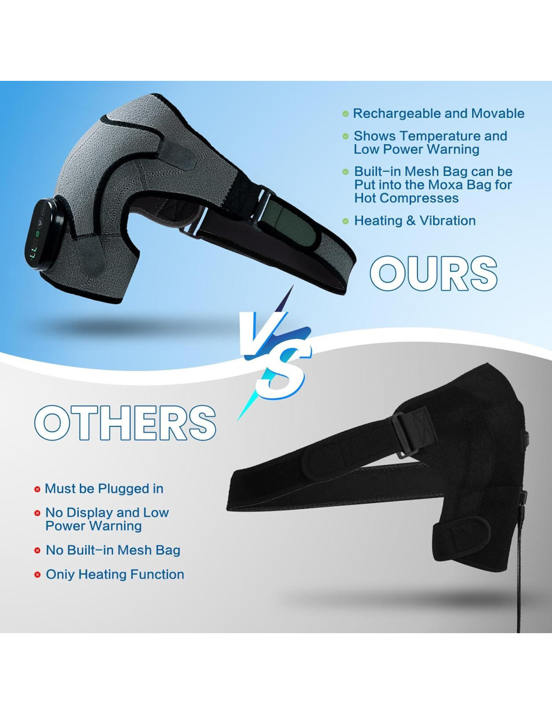 - Soporte flexible y calentado para hombro que proporciona soporte, calor y masaje. Mejora el flujo sanguíneo y alivia el dolor muscular, ayudando a quienes tienen problemas de hombro como periarthritis, desgarros del manguito rotador y rigidez. Un botón de bloqueo previene toques accidentales. Se puede usar durante actividades diarias como conducir, trabajar, jardinería y más.