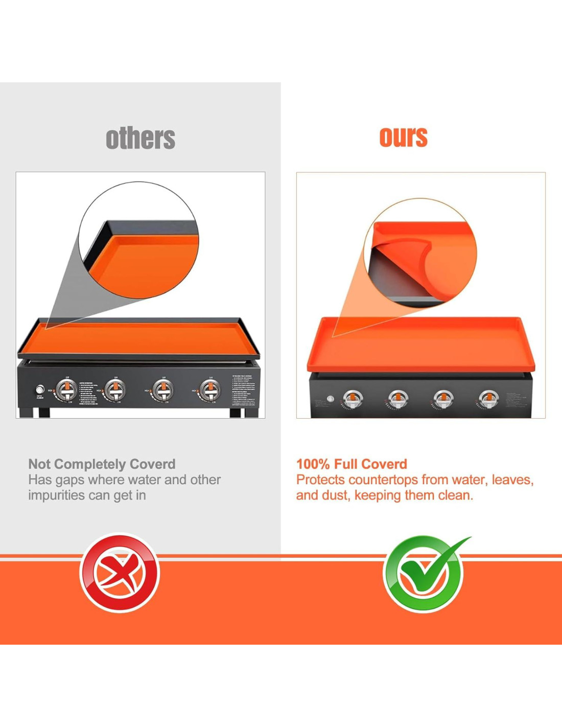 - Protección de Bisel Completo-Comparado con otras alfombrillas de silicona para planchas, nuestra cubierta de silicona Blackstone presenta un diseño de bisel completo, proporcionando protección total para tu plancha. Es impermeable, resistente a hojas, roedores y más. No importa las condiciones climáticas, puedes dejarla en tu parrilla con confianza, extendiendo la vida útil de tu cubierta de silicona Blackstone.