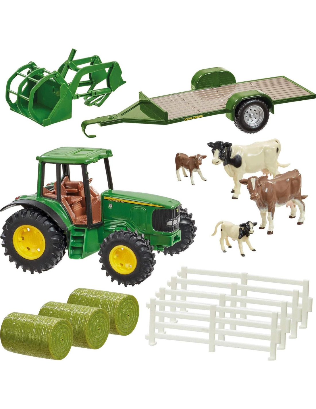 - Juguete Coleccionable: El juguete interactivo viene con un tractor de 8 pulgadas (20.32 cm), carretilla plana, cargadora frontal, 3 fardos, 4 vacas y cerca