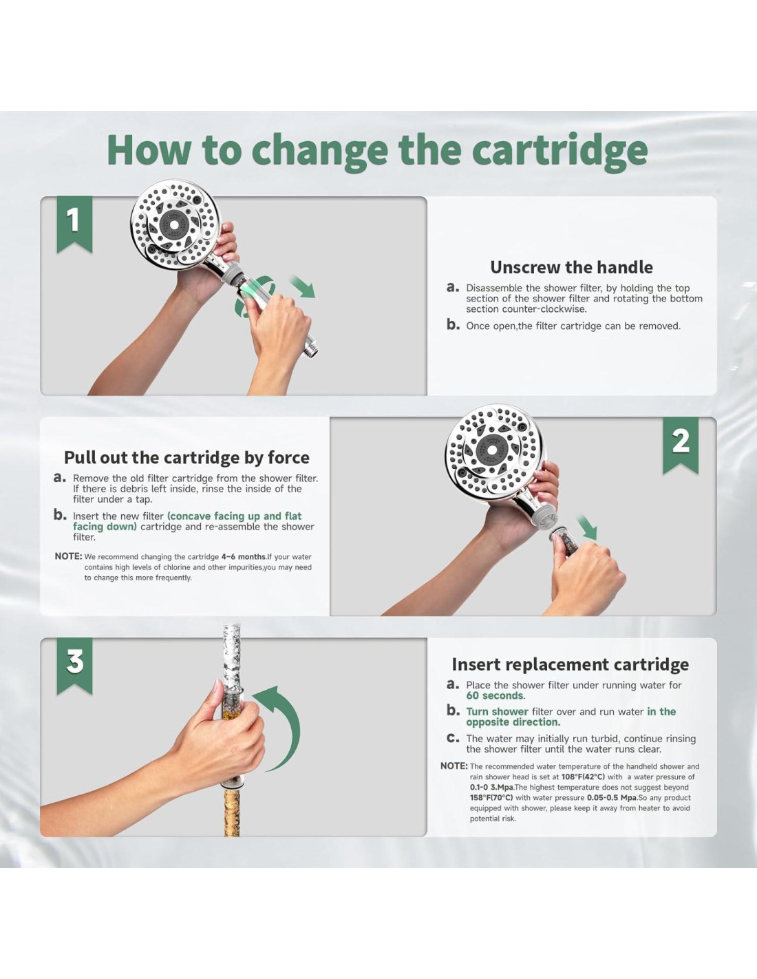 - Fácil Instalación y Reemplazo: ¡Solo toma 1 minuto! No se necesitan habilidades o herramientas especiales. Simplemente desenrosque el cartucho de filtro viejo de su cabezal de ducha girándolo en sentido antihorario, y luego instale el nuevo