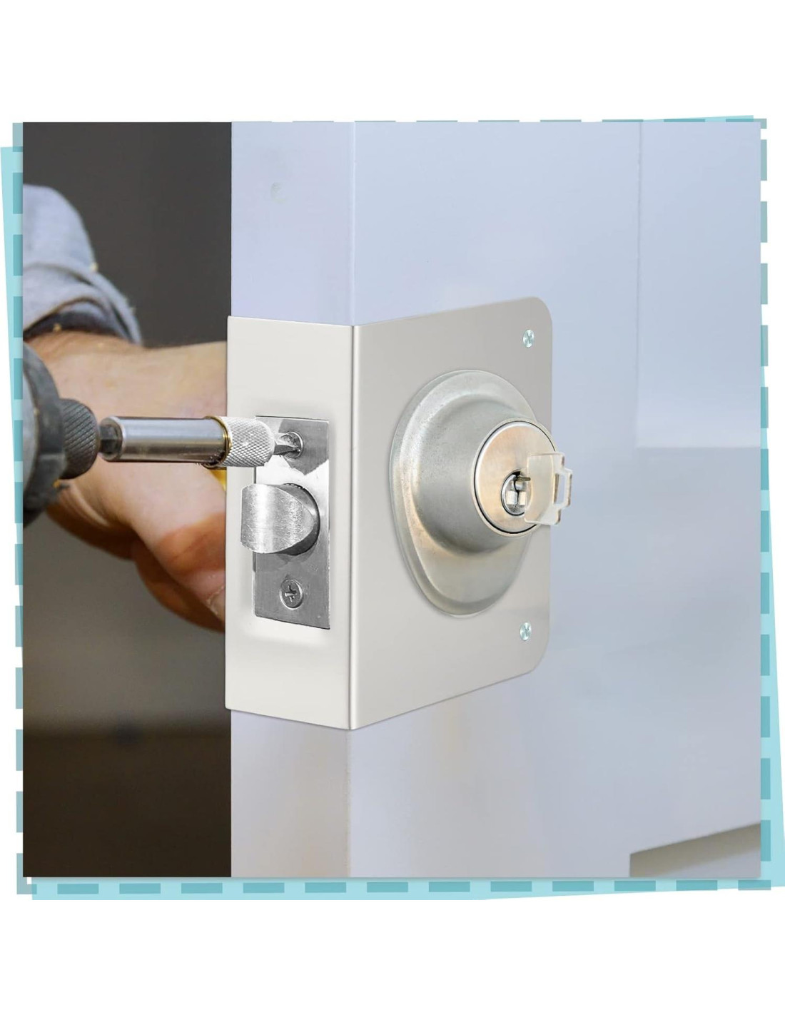 - Fácil de Instalar: la placa de metal para puerta es fácil de instalar, todos los sujetadores de instalación están incluidos con este artículo, puedes medir la distancia del agujero de la puerta antes de la compra, quitar el cilindro de la cerradura y el mango, hacer coincidir el sello de la puerta con el agujero de la cerradura, fijar con tornillos y luego instalar el cilindro de la cerradura. Presenta un bolsillo para placa de pestillo empotrado para una instalación a ras del hardware.