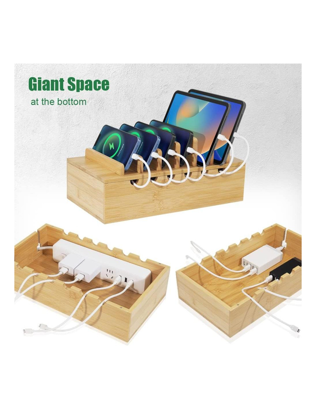 - [Organizador de Múltiples Dispositivos] - La estación de acoplamiento de bambú LEOKKARR puede acomodar al menos 6 dispositivos inteligentes, compatible con iPhones, iPads, Airpods, teléfonos inteligentes Android, dispositivos USB, tabletas, cámaras, Switch, kindle, bancos de energía, auriculares, y más. Mantiene sus dispositivos en orden y ayuda a limpiar la carga de dispositivos apilados.