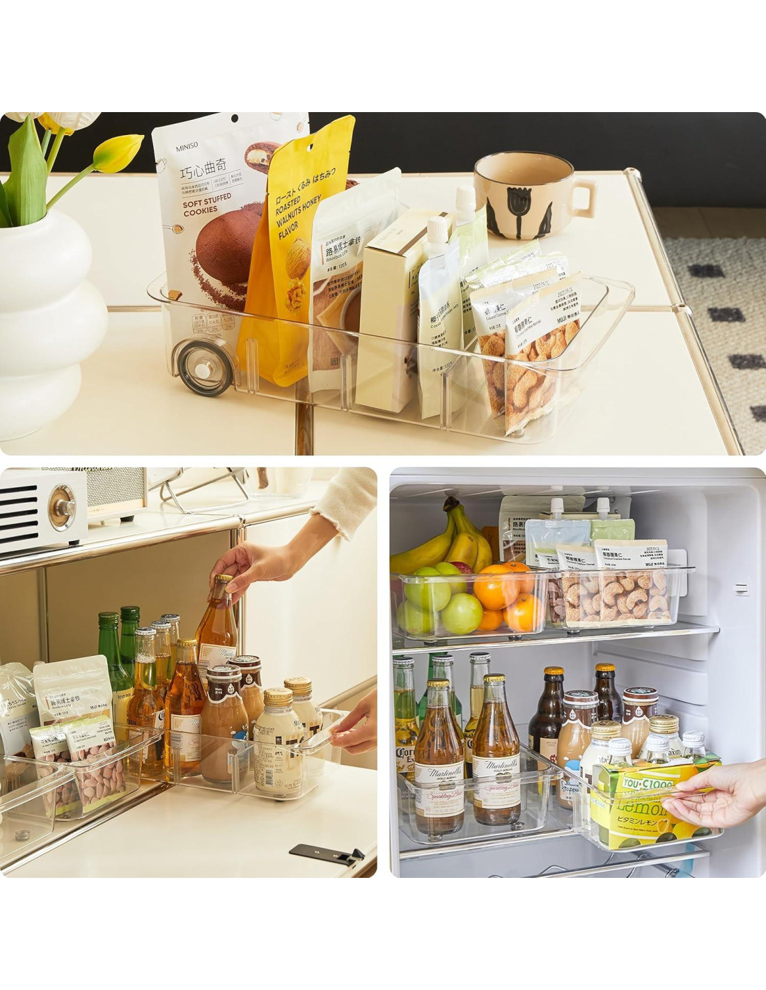 - Transparente y Personalizable: Los bins organizadores de refrigerador están hechos de plástico PET grueso, son muy duraderos con un aspecto cristalino. Equipados con 3 divisores ajustables para crear compartimentos personalizados