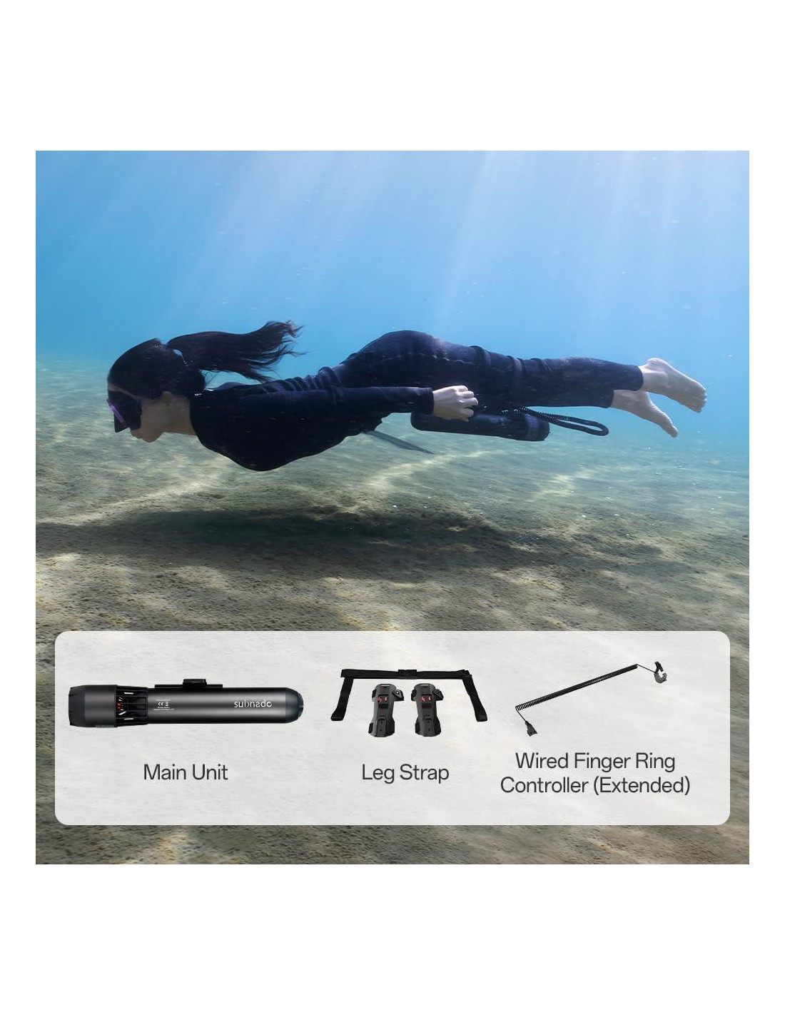- Unidad Principal Solo: La unidad principal del scooter submarino Subnado NO incluye accesorios. Para asegurar el funcionamiento normal, por favor añada accesorios como el controlador de anillo para los dedos, soportes de montaje y accesorios adicionales