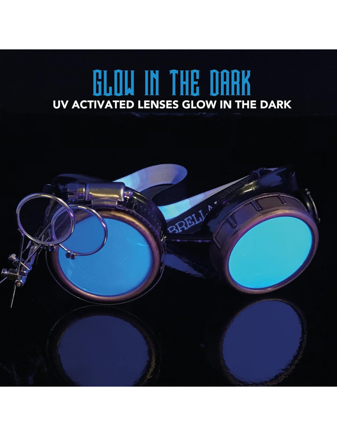- Detalle impecable: Las lentes de difracción prismática 3D en neón azul que brillan en la oscuridad, el acabado negro elegante y el brillante diseño de rosa de los vientos en cada lado te mantienen estilísticamente bien equipado. Nuestras gafas steampunk / gafas de rave son impresionantes en cualquier momento, con un estilo sorprendente durante el día y brillan con luces negras por la noche