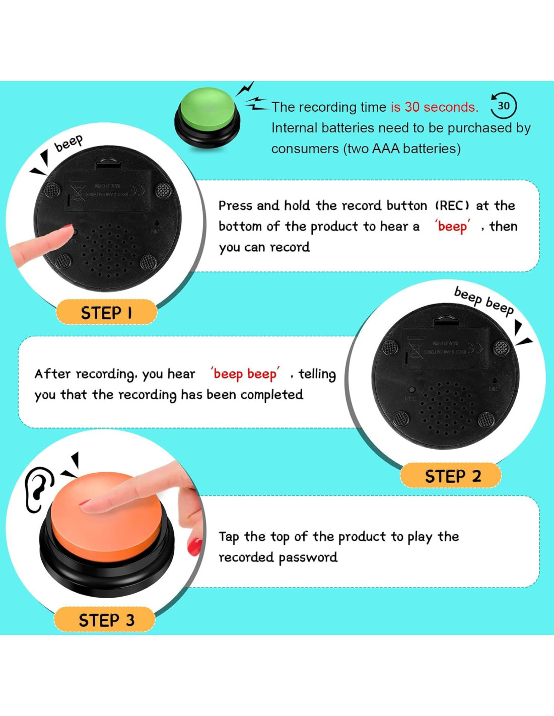 - Accesorios para Entrenamiento de Mascotas: puedes grabar varios comandos como Comida, Bebida, Jugar, Afuera, Sí, No, Abrazo y más, para que tú y tus mascotas se comuniquen contigo y entiendan fácilmente sus necesidades; Hay 4 colores diferentes como opciones para que elijas, permitiéndote usar estos botones de comunicación para diferentes entrenamientos
