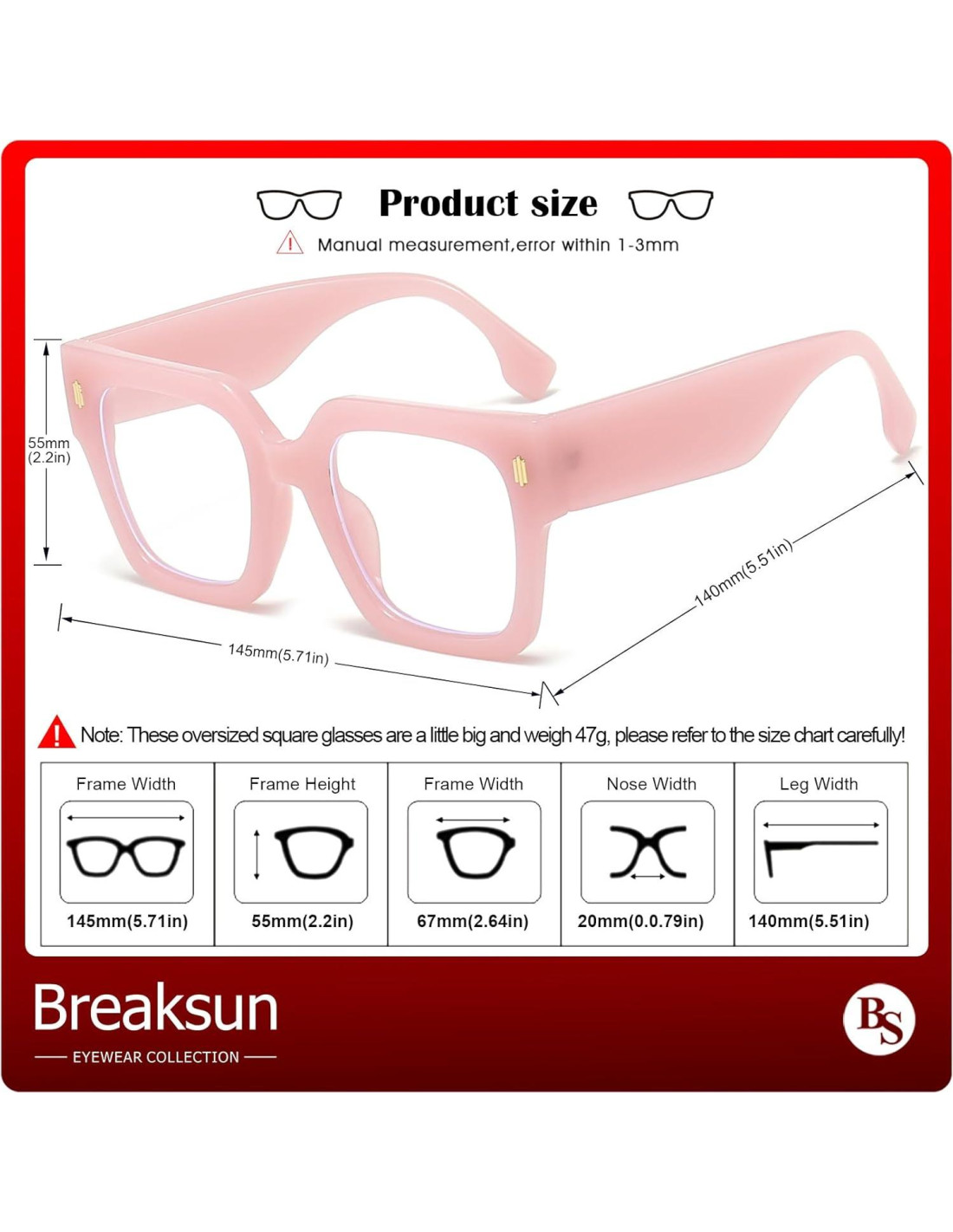 - NOTA: Estas elegantes gafas grandes cuadradas anti-luz azul tienen un diseño de marco grande retro, son muy grandes y un poco pesadas (aproximadamente 0,10 lbs o 47 g), así que por favor consulta la tabla de tamaños cuidadosamente.