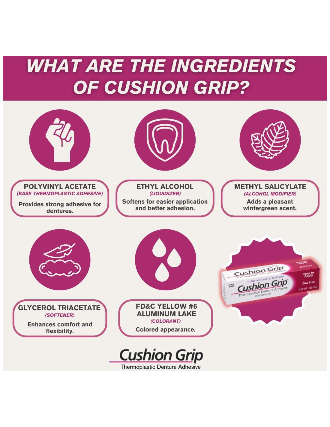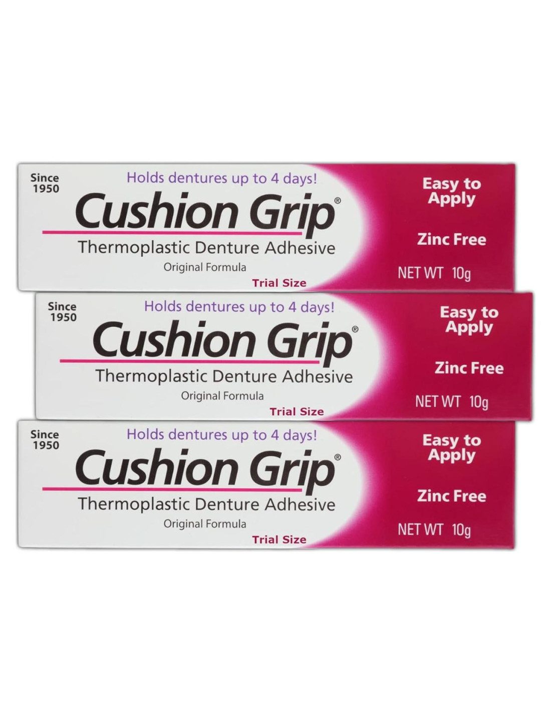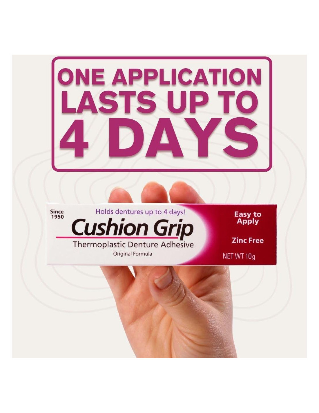 Obtén la comodidad necesaria al usar dentaduras y siéntete más a gusto al comer y reír frente a otros sin miedo a que tu dentadura se suelte. El adhesivo para dentaduras de termoplástico Cushion Grip ajusta y aprieta dentaduras sueltas al llenar los espacios entre las encías y las dentaduras, actuando como un reforzador suave. Asegura un ajuste ceñido para dentaduras que no encajan exactamente bien, permitiéndote mantenerte seguro entre las citas de ajuste. Con solo una aplicación, los usuarios de dentaduras pueden obtener hasta cuatro días de sujeción segura y cómoda. Crea un sello de succión que mantiene las dentaduras firmemente en su lugar, asegurando comodidad y confianza durante todo el día. Cushion Grip previene el movimiento de las dentaduras y las llagas, ofreciendo una sensación suave y acolchada para un uso duradero. La fórmula termoplástica única de Cushion Grip mantiene las dentaduras de forma segura hasta cuatro veces más que otras marcas de adhesivos líderes, permitiéndote usar tus dentaduras con la comodidad y el soporte necesarios para un ajuste perfecto. Un adhesivo termoplástico maleable que actúa como un reforzador suave, llenando los espacios entre las dentaduras y las encías encogidas para proporcionar succión, estabilidad y comodidad. Acolcha las áreas afectadas por dentaduras sueltas, previniendo deslizamientos y molestias, permitiendo a los usuarios de dentaduras hablar y comer con confianza. El cojín dental asegura dentaduras mal ajustadas, previniendo el desplazamiento al hablar y comer, y mantiene las partículas de comida alejadas para evitar la irritación de las encías, asegurando una experiencia de comer más cómoda y sin dolor. Eliminando la molestia de la aplicación diaria de adhesivo, Cushion Grip ofrece una rutina de dentaduras sin mantenimiento que es más conveniente. Es 100% impermeable, asegurando una sujeción segura que soporta la limpieza, el remojo, la comida y la bebida. A diferencia de los adhesivos tradicionales, esta fórmula no pierde su poder de sujeción, incluso después de lavados repetidos. Ofrece una limpieza limpia y sin desorden, para que puedas poner fin a las tediosas rutinas nocturnas y al residuo en tus encías y el paladar. Seguro para usar con cualquier placa de dentadura de porcelana o plástico sin el riesgo de ingerir zinc, ofreciendo una solución segura y conveniente para la comodidad de las dentaduras. Nuestra fórmula libre de zinc y no tóxica proporciona seguridad y tranquilidad, mientras que la aplicación sin desorden mantiene tu experiencia limpia y simple.