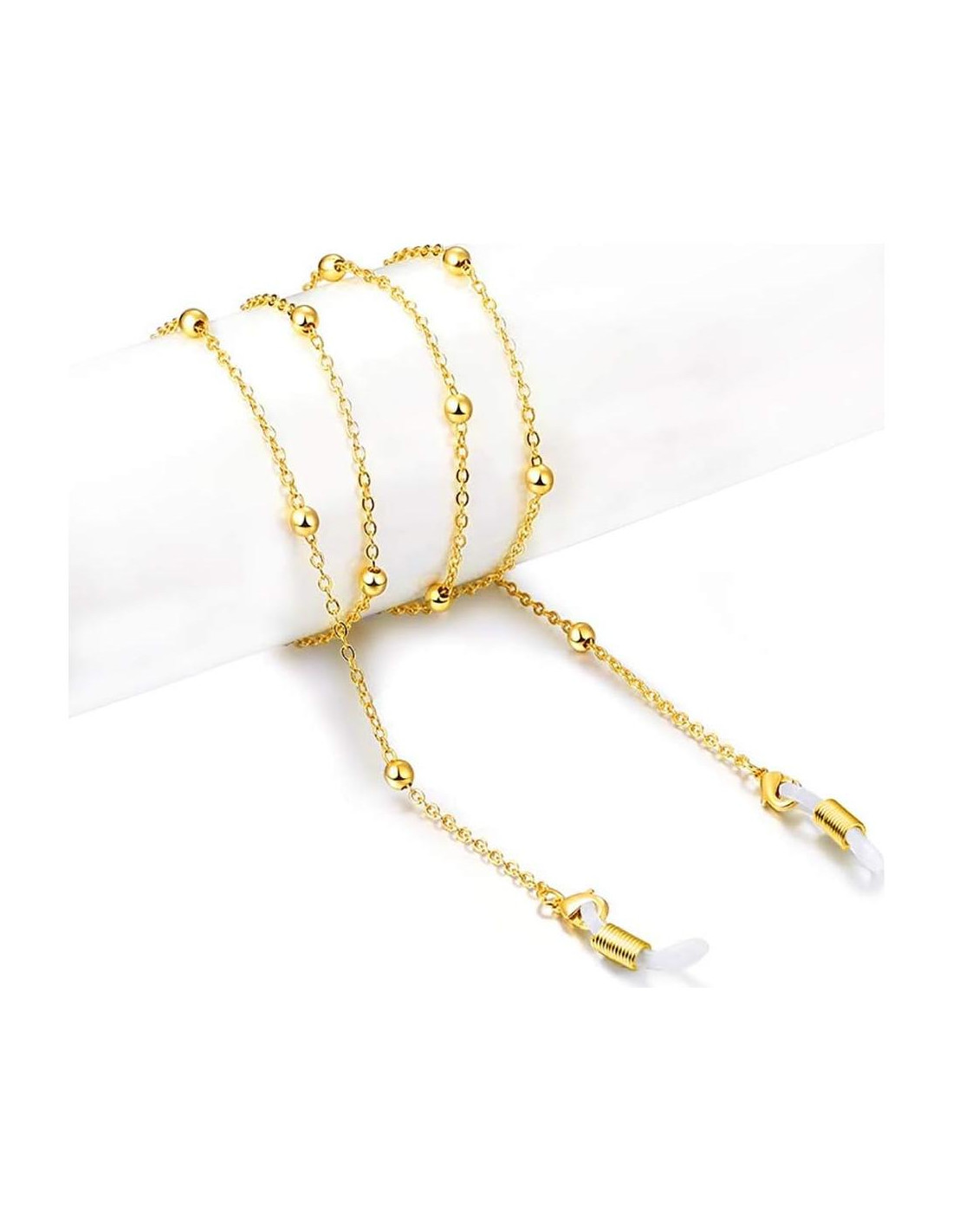 Sujeción de cadena para gafas para mujeres: Cuando estás haciendo ejercicio, como senderismo, escalada, ciclismo, pesca, etc., ¿te preocupa que tus gafas se caigan? ¿A menudo no puedes encontrar las gafas en tu vida y trabajo? ¿Buscas correas de gafas confiables que se ajusten al tamaño de tu cabeza? Por favor, elige nuestra cadena de gafas ajustable, podemos resolver todos tus problemas. Estas cadenas para gafas son adecuadas para todos los tipos de brazos de gafas. Características del producto: 1. Cadena de gafas flexible y ajustable, no es fácil que se caiga, adecuada para todos los tipos de gafas. 2. La longitud de la cadena de gafas es aproximadamente 11.8 inches (30 cm), el sujetador de gafas es ajustable, adecuado para todas las formas de cabeza y tamaños de cuello. 3. El material de nuestros sujetadores de gafas alrededor del cuello no irritará tu piel sensible incluso si usas tus gafas todo el día. Garantía de calidad: 1. Como vendedor profesional de amazon, te proporcionamos productos de calidad y el servicio postventa más completo. 2. Cada producto que vendemos tiene una estricta inspección de calidad y tiene una garantía de calidad a largo plazo, por favor, siéntete seguro de comprar. 3. Si tienes alguna pregunta, no dudes en contactarnos por correo electrónico, te daremos una respuesta satisfactoria dentro de 24 horas. Consejos: 1) Para proteger el brillo metálico, puedes aplicar la cadena con un esmalte de uñas transparente delgado. 2) Evita el contacto con lociones, laca para el cabello o cualquier otro químico que pueda dañar las propiedades originales, para prevenir la reacción química en la superficie de la cadena de gafas. 3) Por favor, usa un paño suave y seco para limpiar la cadena de gafas. 4) Preserva la cadena de gafas, guárdala por separado en la caja de joyas, para evitar daños por fricción mutua. (Por favor, nota: las gafas no están incluidas en la imagen.)