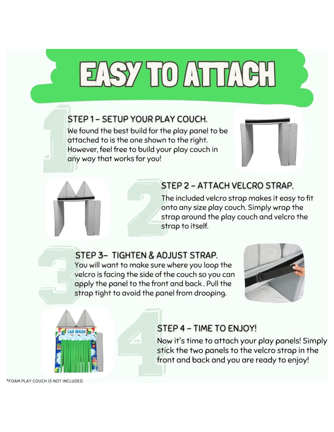 - CONFIGURACIÓN FÁCIL - Nuestros paneles de juego se pueden configurar y cambiar en segundos. ¡Todo lo que necesitas hacer es envolver la correa de velcro alrededor del sofá y estarás listo para comenzar! Tu panel se unirá en segundos. ¿Quieres cambiar el paisaje? ¡Compra múltiples paneles para variar las cosas para tus hijos!