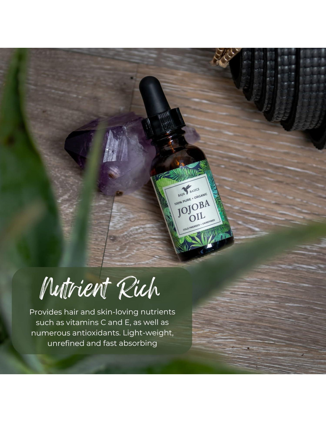 - INGREDIENTES LIMPIOS Y RICOS EN NUTRIENTES: Este único aceite de jojoba, traído a ti por Baja Basics, está especialmente formulado a partir de aceite de jojoba orgánico, prensado en frío y sin refinar. Nos tomamos el tiempo para seleccionar ingredientes limpios y suaves, dejando de lado parabenos y otros químicos dañinos para que recibas un producto de alta calidad. Este producto también es vegano y libre de crueldad. El aceite de jojoba proporciona nutrientes que aman la piel y el cabello, como vitaminas C y E, así como numerosos antioxidantes.