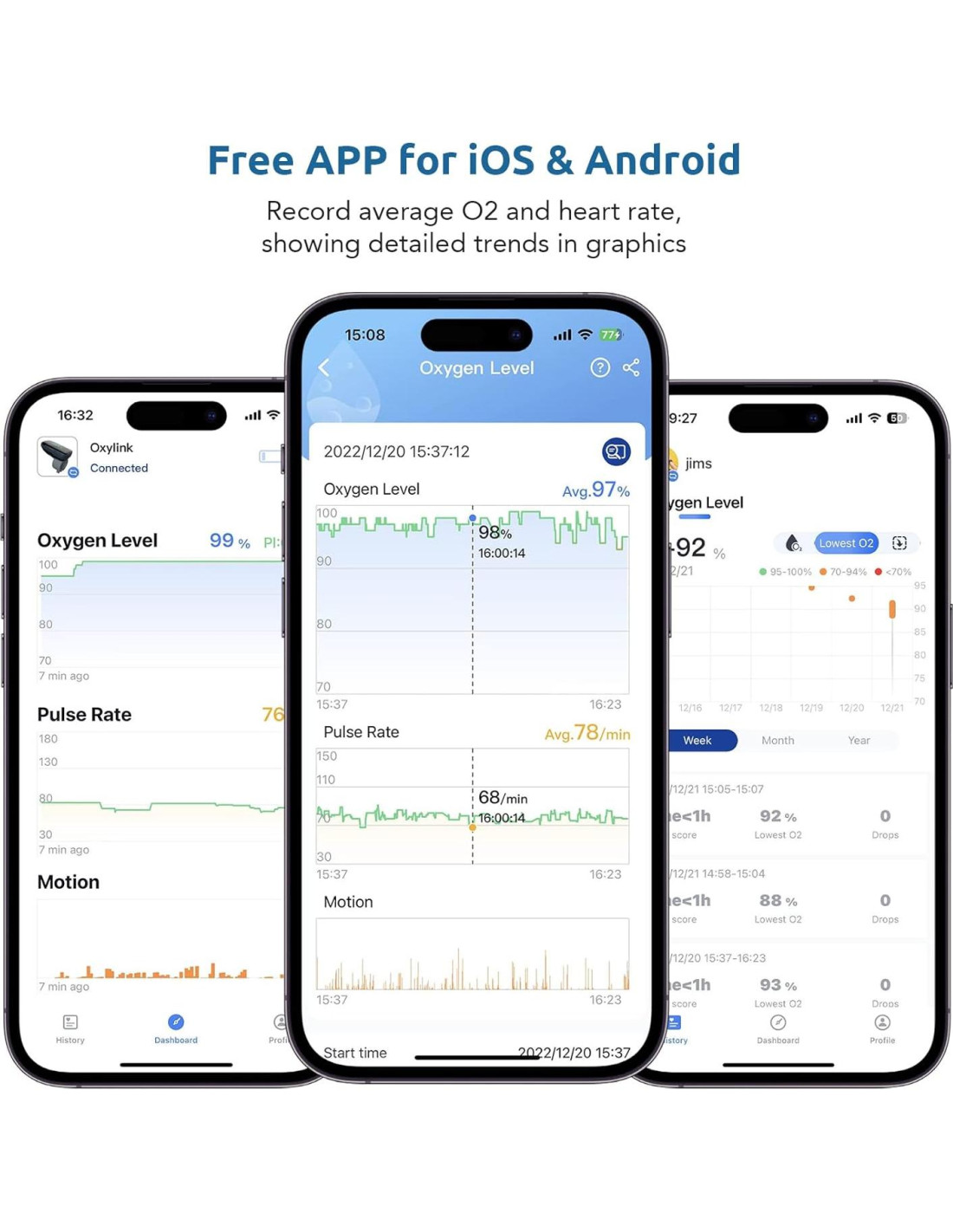 - [Aplicación Gratuita para iOS y Android]: Almacenamiento ilimitado en Vihealth a través de Bluetooth, visualizando el nivel de oxígeno en sangre y la frecuencia cardíaca en tiempo real e histórica en el Tablero de la Aplicación. Soporta sincronización con Apple Health.