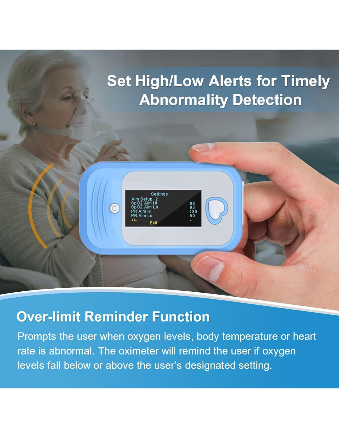- Alertas Instantáneas para Valores Críticos: Establece umbrales altos y bajos personalizados para oxígeno, pulso y temperatura con el AM801. Si las lecturas superan tu rango seguro, emite un pitido y resalta el valor en la pantalla, asegurando conciencia oportuna y acción rápida. Ideal para ancianos, atletas y aquellos con condiciones como EPOC.
