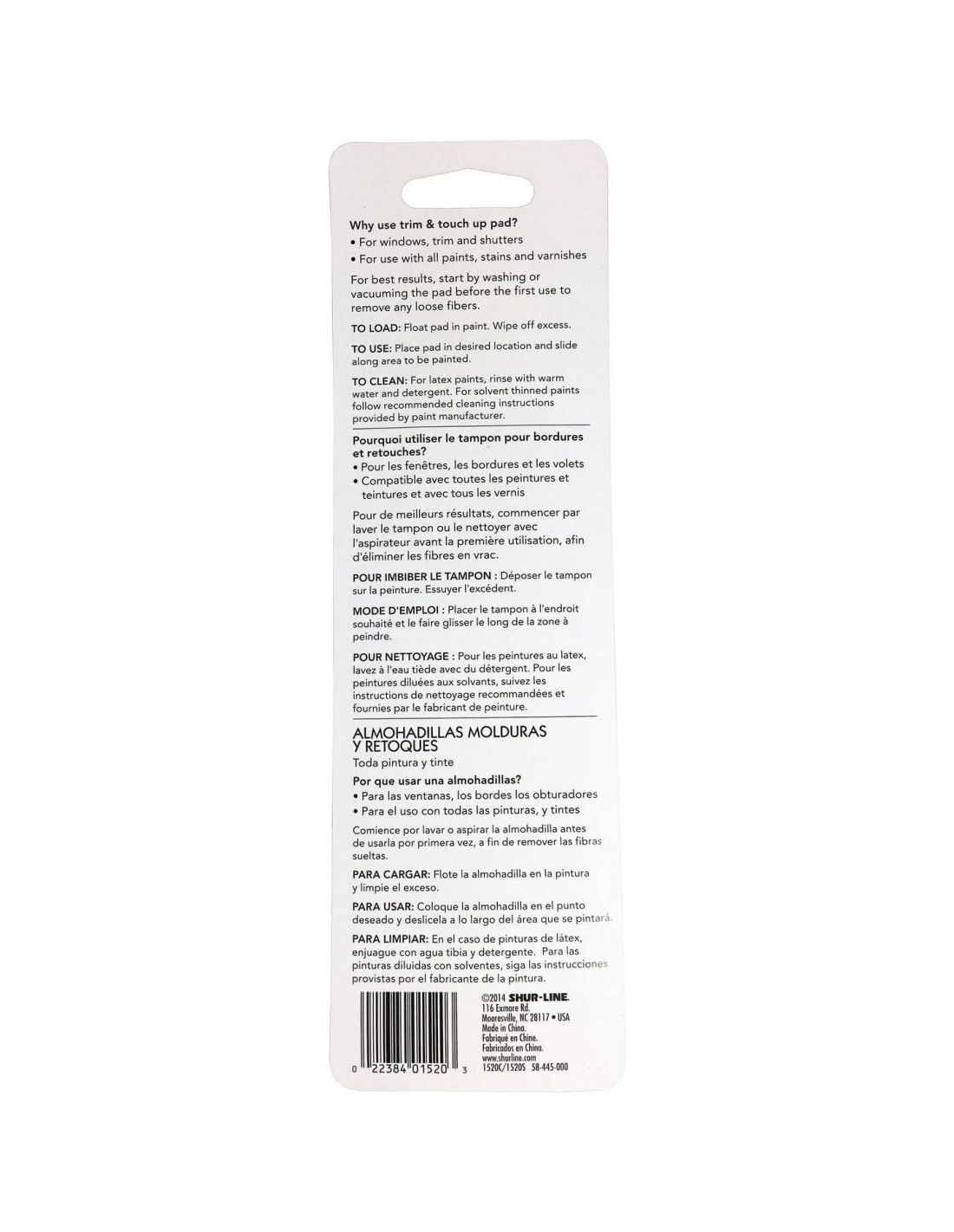 Descripción del Producto Pad de recorte y retocado con recarga, para retocar pequeñas áreas, ideal para retoques de pintura en molduras, marcos, persianas y contraventanas, el pad extra incluido facilita la tinción y el barnizado de la carpintería, rápido y limpio para pintura a base de látex o aceite, tinte, barniz y selladores. Del Fabricante Durante más de 70 años, Shur-Line ha ofrecido aplicadores de pintura innovadores y productos relacionados con la pintura. La marca tiene como objetivo empoderar, motivar e inspirar a los decoradores que hacen su propio trabajo a abordar proyectos, sin importar su tamaño, y divertirse, ahorrar dinero y relacionarse con los espacios en su hogar.
