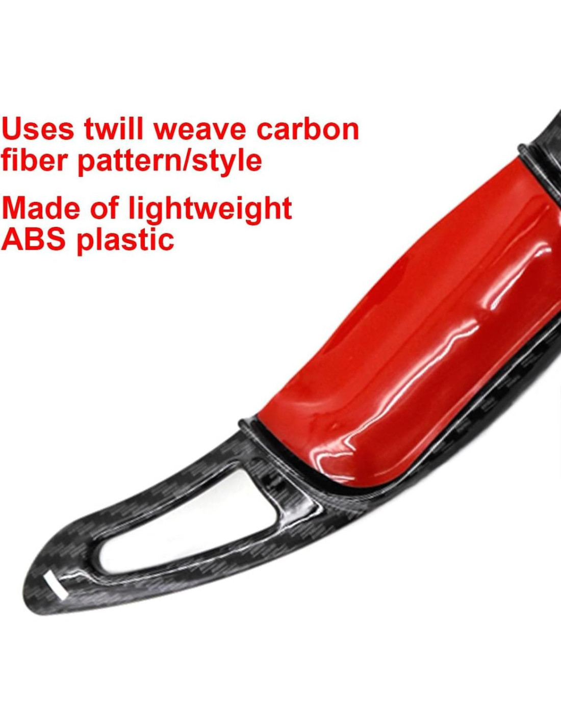 Hecho de plástico ABS ligero en un patrón/estilo de fibra de carbono de tejido de sarga, resistente al desgaste y a la decoloración. Diseño de moda: Mejora la apariencia y la experiencia del usuario con esta palanca, así como el efecto visual extremo. Instalación y limpieza fáciles. No se requieren perforaciones ni herramientas. No daña tu coche. Se instala fácil y firmemente con cinta de doble cara en aproximadamente 2-5 minutos. No se mancha fácilmente y es muy fácil de limpiar para que luzca nuevo durante una larga vida útil. (Usa un encendedor para calentar ligeramente la cinta de doble cara para un mejor efecto) El diseño de la extensión de la palanca de cambio del volante mejora la aceleración y la capacidad de respuesta de manejo del vehículo, mejora la conveniencia de conducción y brinda una mejor experiencia de conducción mientras se asegura la seguridad al conducir.