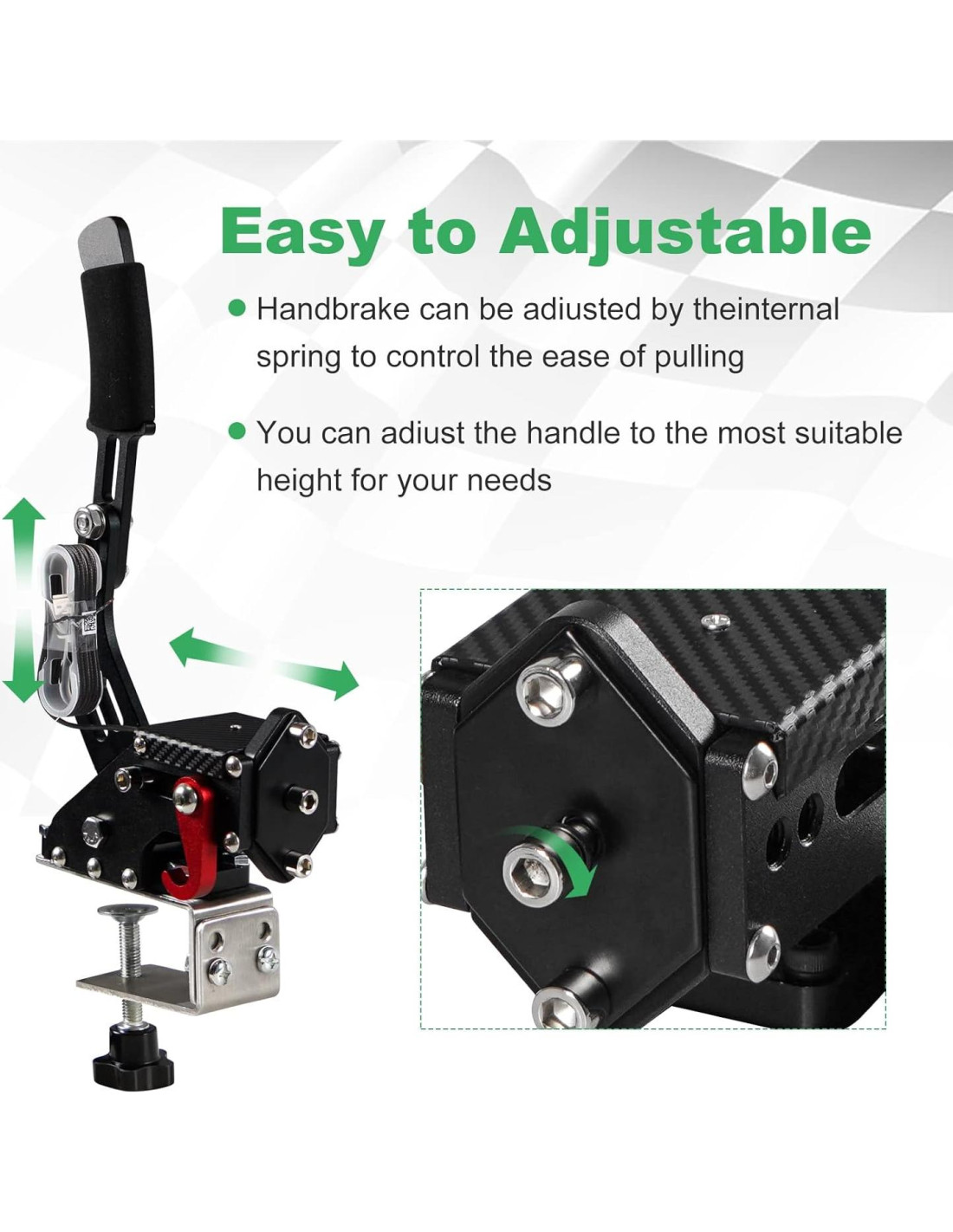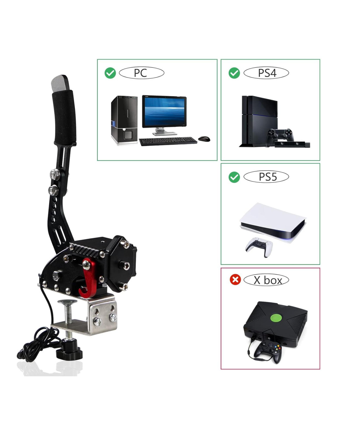 - [Freno de mano USB de estado sólido] : universal para juegos de carreras y simuladores, con pequeño espacio y ahorro de espacio. El mango en forma de arco instalado en el cuerpo humano está firmemente fijado en el mango. Ajuste de altura flexible para la altura de operación de diferentes soportes de volante.