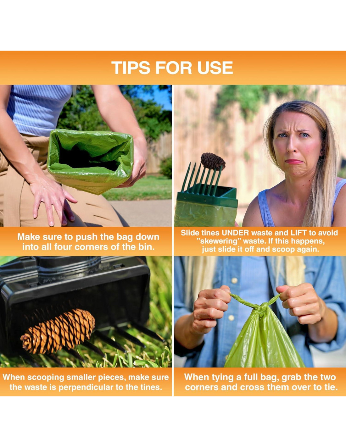- OPERACIÓN CON UNA MANO: El mango ergonómico y el diseño de recoger a bolsa te permiten empaquetar rápidamente los desechos con solo una mano para una eliminación de desechos de mascotas sin esfuerzo en césped, tierra, grava y pavimento. Para piezas más pequeñas, recoge de manera que los desechos estén en horizontal, cubriendo múltiples púas.