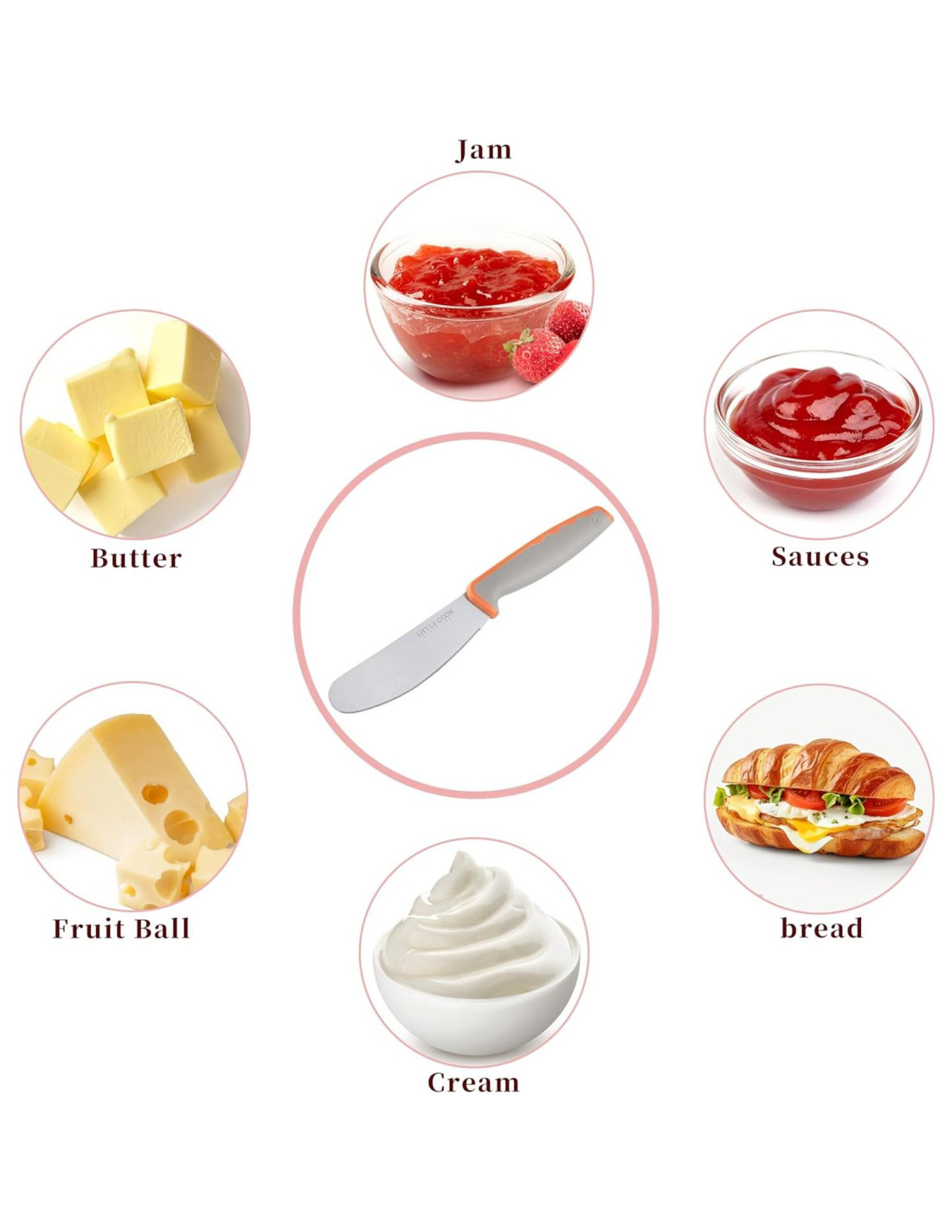 - 2. Diseño Ergonómico Estiloso: El cuchillo para sándwich cuenta con un elegante mango ergonómico en un contemporáneo dúo tono de gris y naranja. Más allá de su atractivo estético, el diseño del mango de este cuchillo espatula de mantequilla proporciona un agarre cómodo y seguro, mejorando la experiencia general del usuario.