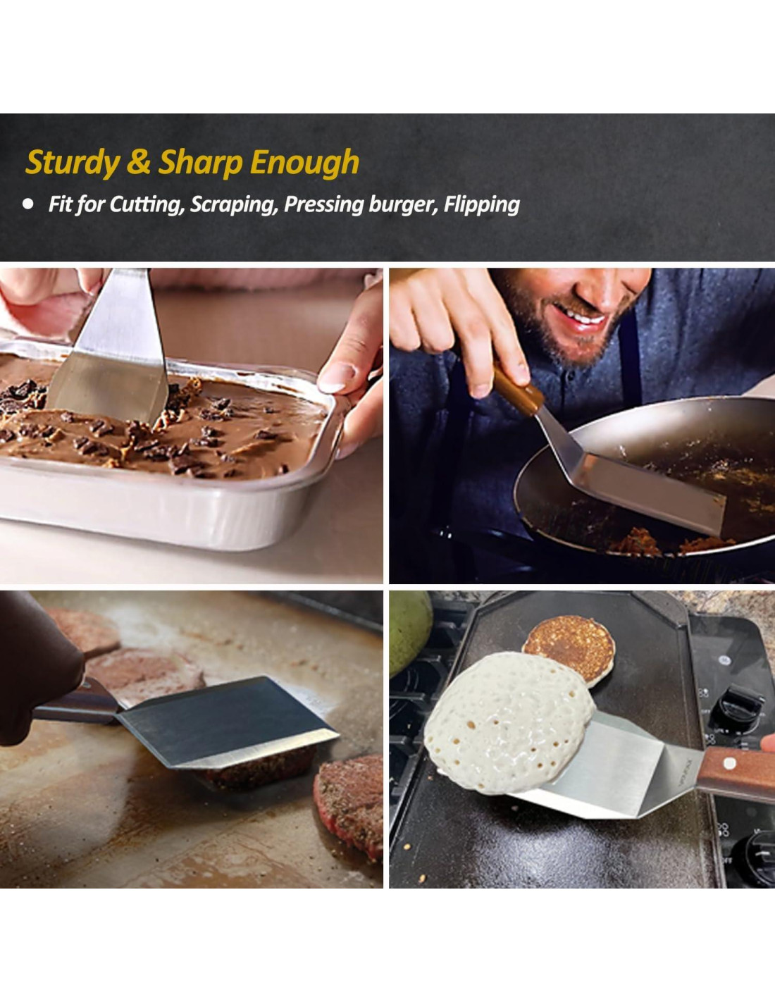 - Juego de espátulas de acero inoxidable profesional de 3 piezas - incluye 1 espátula de cocina, 1 raspadora de masa, 1 espátula para hamburguesas de 5 x 6 pulgadas (12,7 x 15,24 cm). Ideal para usar como espátula para panqueques, espátula para pescado, espátula para plancha, espátula de cocina, raspadora para parrilla.
