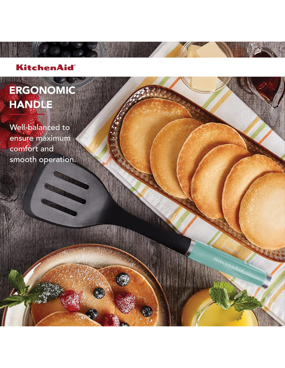 Esta Espátula Ranurada de Nylon Clásica KitchenAid es ideal para voltear y girar alimentos, además de drenar líquidos y grasa. La cabeza de nylon es resistente al calor hasta 232C y es segura para usar en todas las ollas y sartenes, incluyendo las antiadherentes. Apta para lavavajillas.