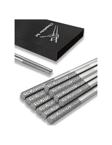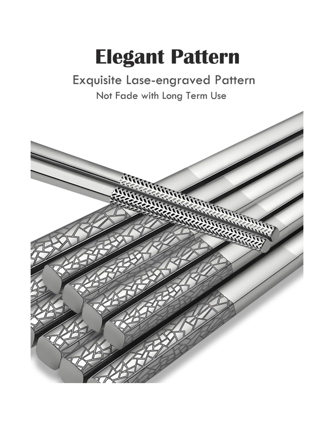 - Diseño antideslizante: Diseño de función antideslizante perfecto para nuevos principiantes que aprenden a usar palillos de la manera correcta. Nuestros palillos de metal tienen punta antideslizante y cuerpo cuadrado. El grabado láser reforzado en la punta de los palillos de acero inoxidable hace que los palillos de metal sean más fáciles de agarrar y mejor antideslizantes. Los palillos de metal con cuerpo cuadrado son más fáciles de usar y más cómodos al sostener en la mano. Los palillos cuadrados no rodarán en la mano