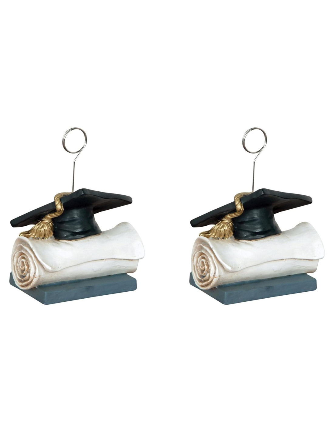 Soportes de Foto/Globo de Graduación Beistle - 2 Contar Celebra el logro académico con estilo y función utilizando los Soportes de Foto/Globo de Graduación Beistle. Este conjunto de dos pesos de mesa resistentes está diseñado para agregar elegancia y versatilidad a tu decoración de graduación. Cada soporte está esculpido en polystone duradero y estilizado para parecer un diploma enrollado clásico coronado con un gorro de graduación negro mate y un borlas dorada. Midiendo aproximadamente 10.16 cm de alto (4 pulgadas) y pesando 170.1 g (6 oz) cada uno, proporcionan la cantidad perfecta de peso para globos de helio, números de mesa, fotos o señalización de eventos. En la parte superior de cada peso decorativo hay un clip de alambre de acero inoxidable que asegura fácilmente artículos ligeros como fotos impresas del graduado, tarjetas de nombre, mensajes de felicitación o globos flotantes. Estos soportes son perfectos para fiestas de graduación de todos los niveles, desde preescolar hasta secundaria, universidad y más. Colócalos en mesas de comida, exhibiciones de recuerdos o cabinas de fotos para un aspecto festivo y coordinado. Con su construcción reutilizable y tema atemporal, estas piezas se convierten en una parte duradera de tu celebración.