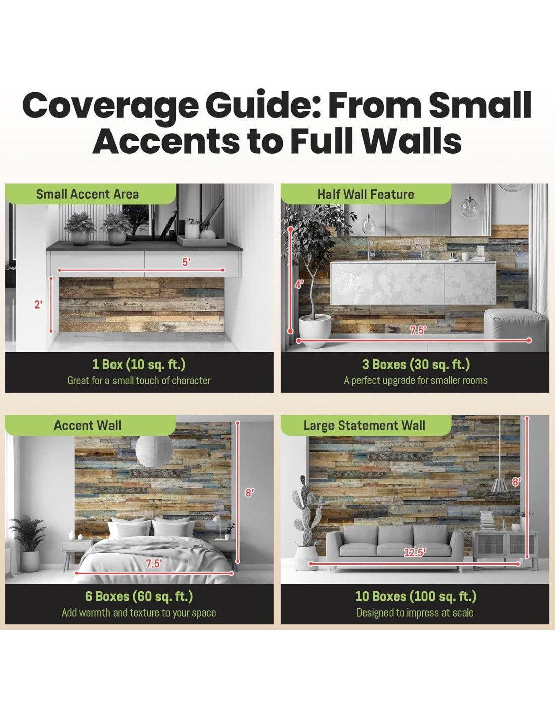 - VERDADERA PROFUNDIDAD 3D Y TEXTURA DINÁMICA: A diferencia de paneles planos que solo imitan la profundidad, nuestros tablones varían en ancho y grosor para un aspecto auténtico y en capas. La interacción de luz y sombra a través de la superficie desigual expande visualmente tu espacio, haciéndolo sentir más abierto y atractivo. Cada paquete de madera incluye anchos de tablones variados (5.08 cm, 7.62 cm, 12.7 cm), longitudes (40.64 cm, 81.28 cm, 121.92 cm) y grosor natural 3D (0.64 cm-1.27 cm) para un verdadero carácter dimensional. Las fotos son representativas; los colores y texturas reales pueden variar entre cajas.
