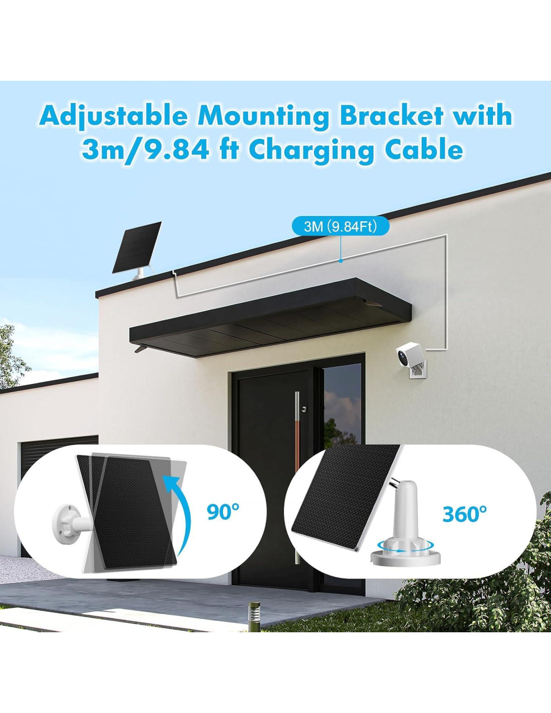 - Panel Solar Plug-and-Play con Soporte Rotatable de 360: Con un soporte rotatable de 360 y un cable micro USB de 10 pies (3 m) (incluye adaptador de Micro USB a Tipo-C), este panel solar permite una instalación flexible bajo la luz solar directa. Simplemente atorníllalo en su lugar y conéctalo a tu cámara - no se requiere configuración complicada. Ideal para aleros, paredes o tocones de árboles.