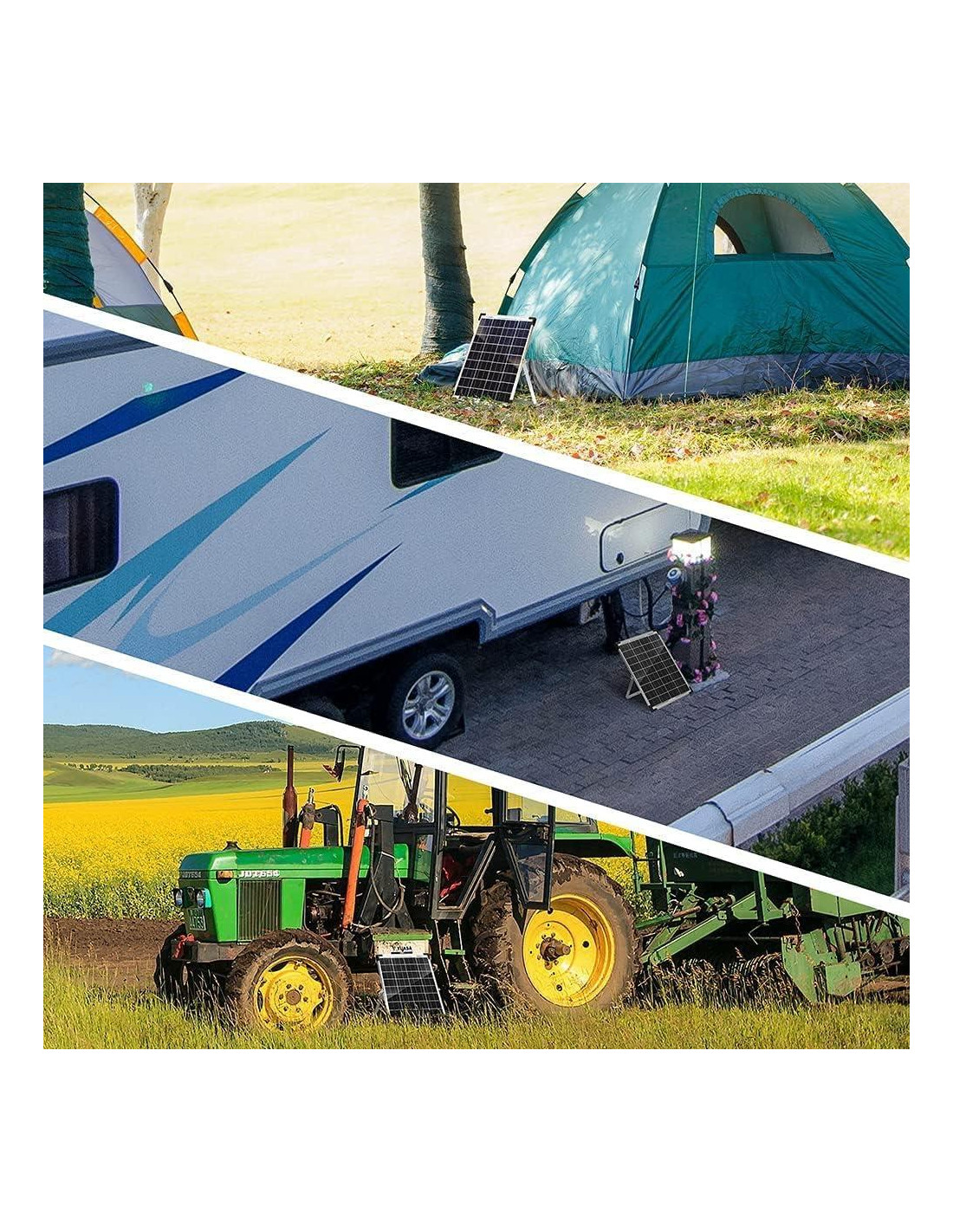 - Solución de Energía Versátil - Nuestro panel solar de 12 Voltios es un kit ideal para cargar baterías de 12V y alimentar varios dispositivos de corriente continua. Es adecuado para una variedad de escenarios que incluyen RVs, automóviles, barcos, cercas, cámaras de seguridad, invernaderos, cortadoras de césped, motocicletas, motos de agua, remolques, hogares y más.