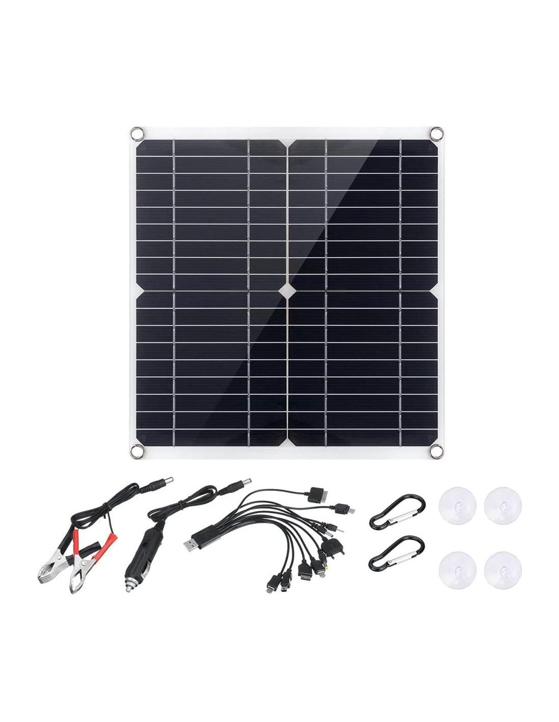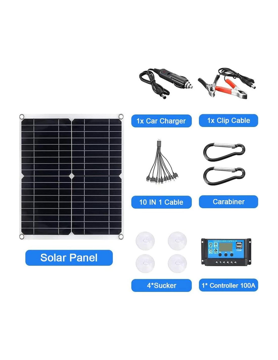 Kit de Panel Solar de 200 Vatios para Mantenimiento de Baterías y Carga Lenta con Controlador de Carga Solar de 100A Casos de Uso: Cargar Baterías de Vehículos de 12V como Coches y Barcos, y Cargar Dispositivos de 5V como Teléfonos Móviles y Cámaras de Acción. Descripción: Estructura de los Paneles Panel Solar: Panel de Silicio Monocristalino Dimensiones del Panel Solar: 280x280x3mm Voltaje de Trabajo del Panel Solar: 18V Voltaje de Circuito Abierto del Panel Solar: 21.6V Corriente de Cortocircuito del Panel Solar: 1.11A (Máx) Puerto de Salida: Doble Usb, Dc5521 Femenino Características del Producto: 1. Módulo Regulador de Voltaje Integrado, Salida de Regulador de Voltaje Usb Doble de 5V 2. La Pantalla Lcd Facilita el Monitoreo Visual del Estado de Funcionamiento y la Batería. 3. Equipado con Línea de Carga 10 en 1, Plug and Play, Conectar y Desconectar es Fácil y Sencillo. El Paquete Incluye: Combo: 1 x Panel Solar (Con Accesorios), y 1 x Controlador