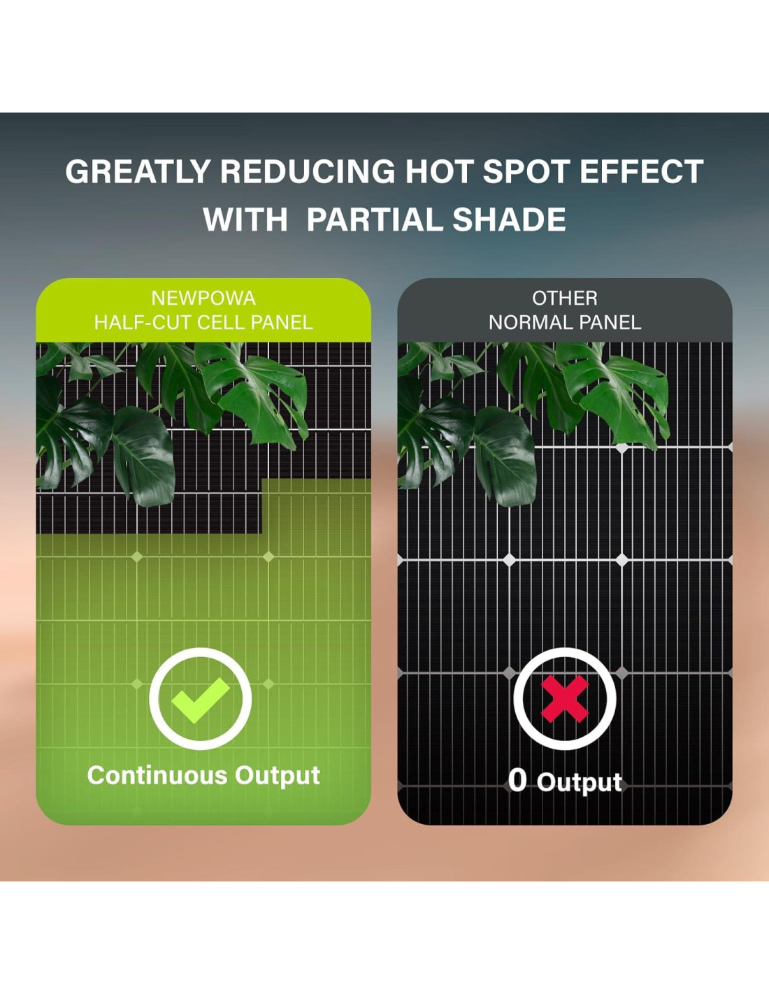 - [Panel Solar Bifacial Newpowa] Los paneles solares bifaciales de 200w de Newpowa pueden generar electricidad desde la parte trasera. La parte trasera del panel solar bifacial de Newpowa puede generar electricidad a partir de la luz reflejada que proviene del suelo, etc. Cuanto más reflectante sea el suelo, más luz puede ser absorbida por la parte trasera del panel solar. La generación de electricidad también será mejor. (Basado en nuestra experiencia de instalación, cuanto mayor sea la altura desde el suelo, más efectiva será la ganancia trasera. Recomendamos instalar este panel solar preferiblemente entre 28-50 pulgadas sobre el suelo.)