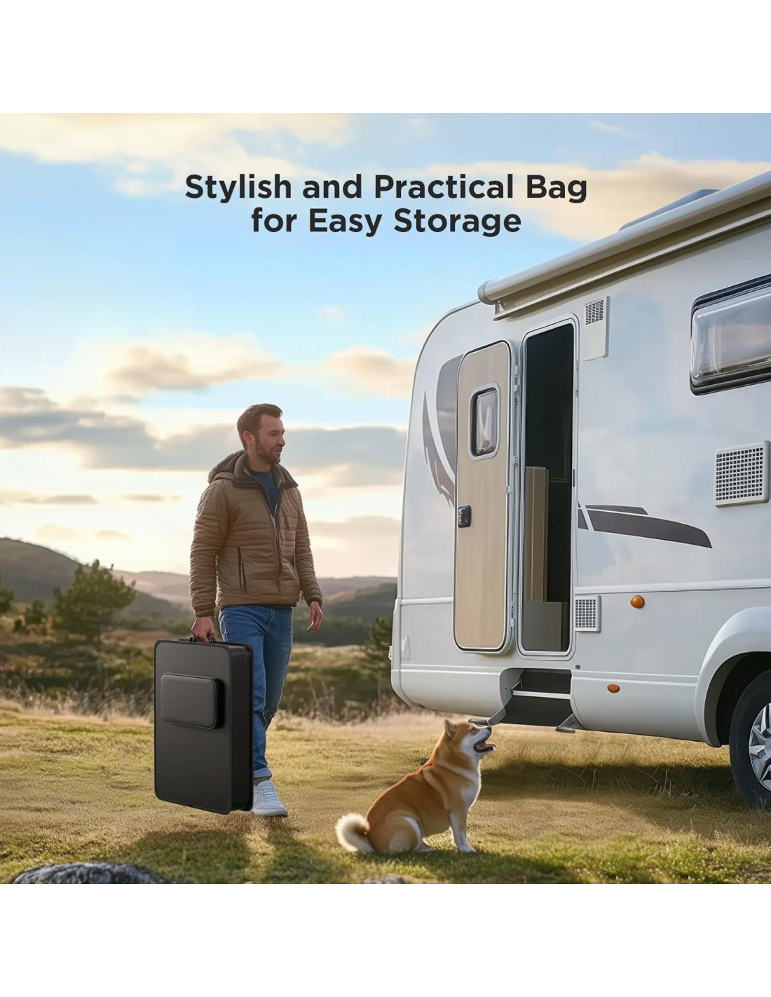 - [Plegable y Fácil de Configurar] Nuestro panel solar de 200w es compacto y plegable, con dimensiones plegadas de 68.58*45.72*8.99 cm y un peso de 9.3 kg. Este panel solar de 200w incluye una elegante bolsa de transporte para fácil almacenamiento en tu camper o RV sin ocupar mucho espacio. Para una fácil configuración, simplemente despliega el panel y ajusta las 4 patas a un ángulo de aproximadamente 90 grados hacia el sol para una salida óptima de energía. Perfecto para energía conveniente y que ahorra espacio en movimiento.