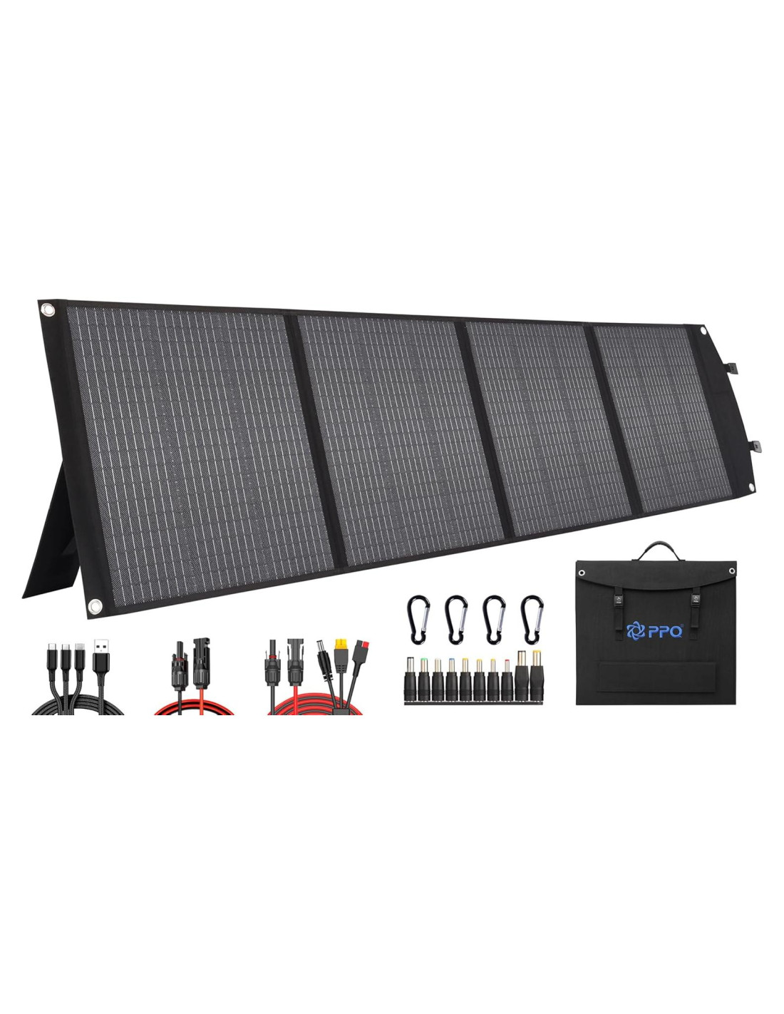 - Componentes incluidos: Panel Solar Plegable de 200W, Cable Doble DC, Cable DC-MC4, Conector DC 10-en-1, Conector USB 3-en-1 y 4 Ganchos de Mosquetón