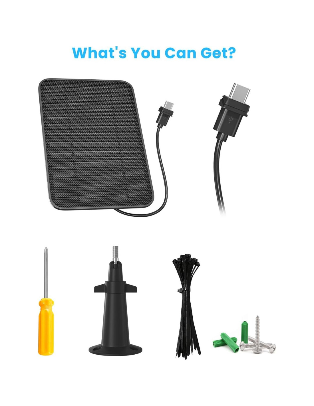 - Paquete Incluido Los kits de panel solar están hechos de materiales de alta calidad y respetuosos con el medio ambiente, incluyendo 4 paneles solares con cable de 4 m, 4 soportes de montaje de 360 grados, 4 bolsas de tornillos, 320 bridas para cables, 1 destornillador. Ten en cuenta que la eficiencia de carga depende de la intensidad de los rayos del sol y la velocidad a la que las cámaras exteriores consumen energía. Si tienes alguna pregunta, no dudes en contactarnos, tu satisfacción siempre es nuestro objetivo.