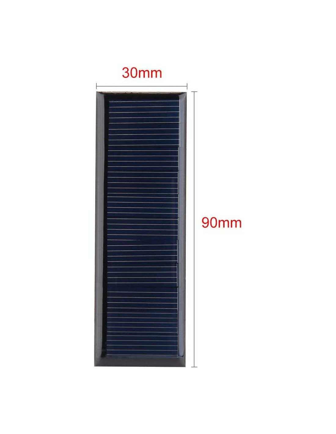 Descripciones: Proporciona una alta tasa de conversión y una salida increíblemente eficiente. Excelente rendimiento incluso bajo la débil luz solar. Procesamiento único para hacer que el panel sea lo suficientemente duradero para resistir la nieve, y lo suficientemente conveniente para instalar. Tecnología única para evitar la congelación del agua y la deformación dentro del marco. Tamaño portátil, compacto y elegante con una carcasa sólida y atractiva. Aplicación: para cargar celdas, para iluminación del hogar y diferentes tipos de electrodomésticos de bajo consumo, para proyectos científicos, para bomba de agua solar, pequeño sistema de energía solar, etc. Especificaciones: Nombre del producto: Panel Solar Material: Silicio policristalino Voltaje nominal: 5.5V Corriente nominal: 60mA Tamaño: 90mm x 30mm (3.51 pulgadas x 1.17 pulgadas) Grosor: 2.9mm (0.11 pulgadas) Peso: 49g