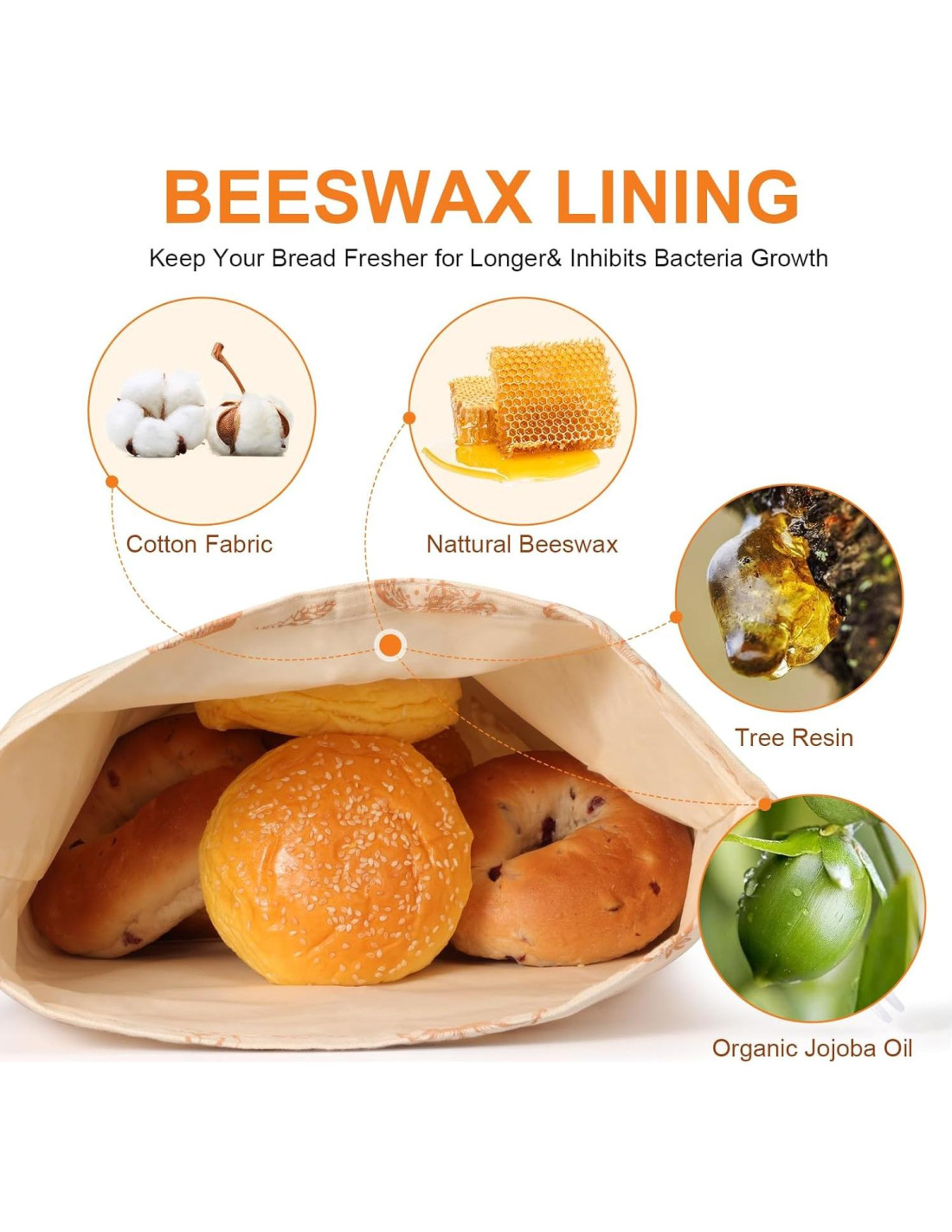 - Construcción de algodón de lino de cera de abejas orgánica premium. Fabricadas con un exterior de algodón de lino transpirable y un revestimiento de cera de abejas natural, nuestras bolsas mantienen la humedad y el flujo de aire óptimos. Esto ayudará a prevenir que el pan se empape mientras mantiene la corteza crujiente por fuera y suave por dentro, muy superior al almacenamiento en plástico o papel.