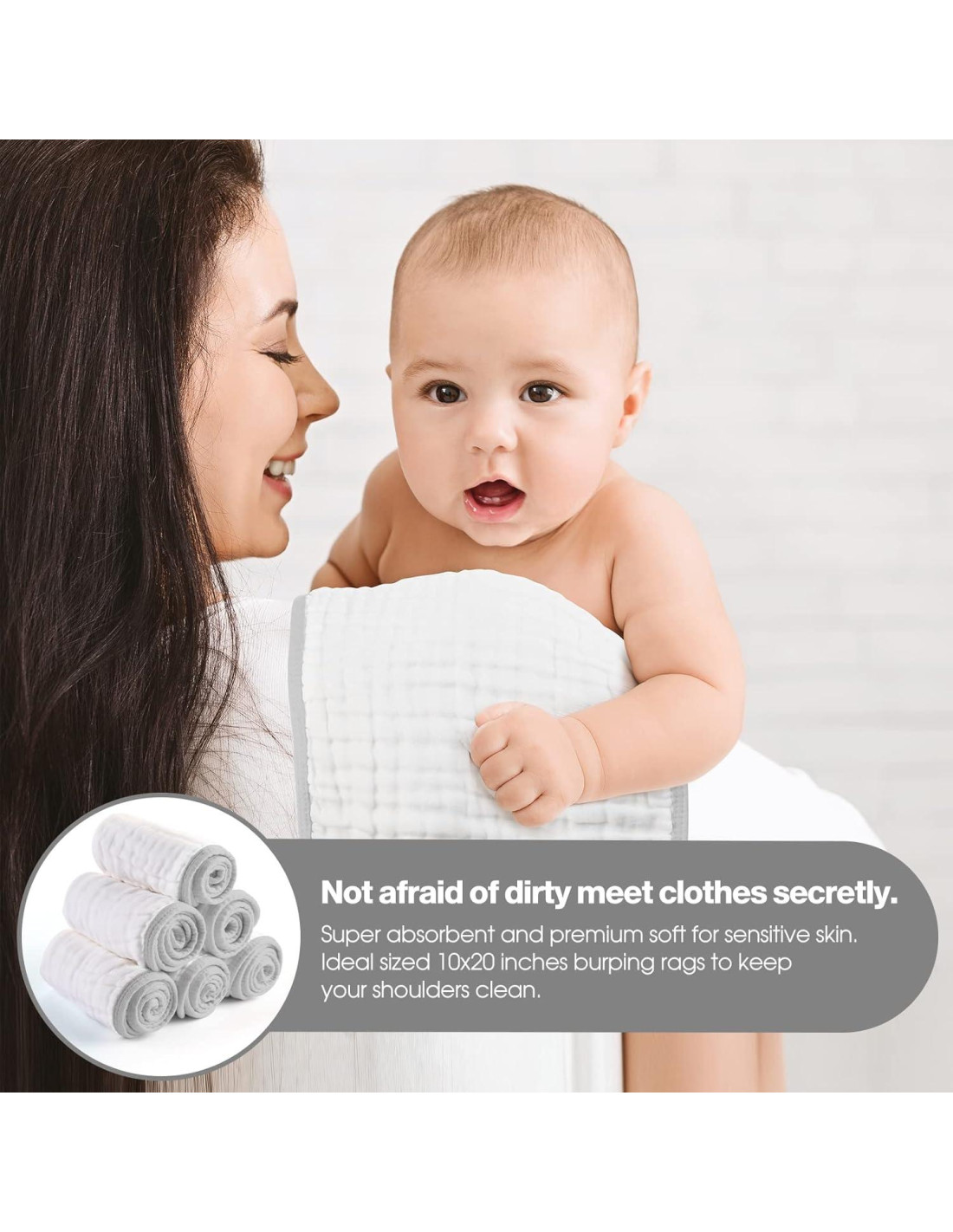 - Sin mantenimiento, libérate - Cuanto más laves, más suave se vuelve el paño de eructo. Nuestra extensión natural de la tela de gasa no se deformará ni se endurecerá después de lavarla, ultra suave como las yemas de los dedos de una madre. Resistente al lavado, resistente al desgaste, tan bueno como un nuevo paño de eructo después de un largo tiempo de uso. 6 Piezas de paños de eructo para bebés satisfacen las necesidades de la lactancia diaria. Lavable a máquina, perfecto para padres modernos ocupados.