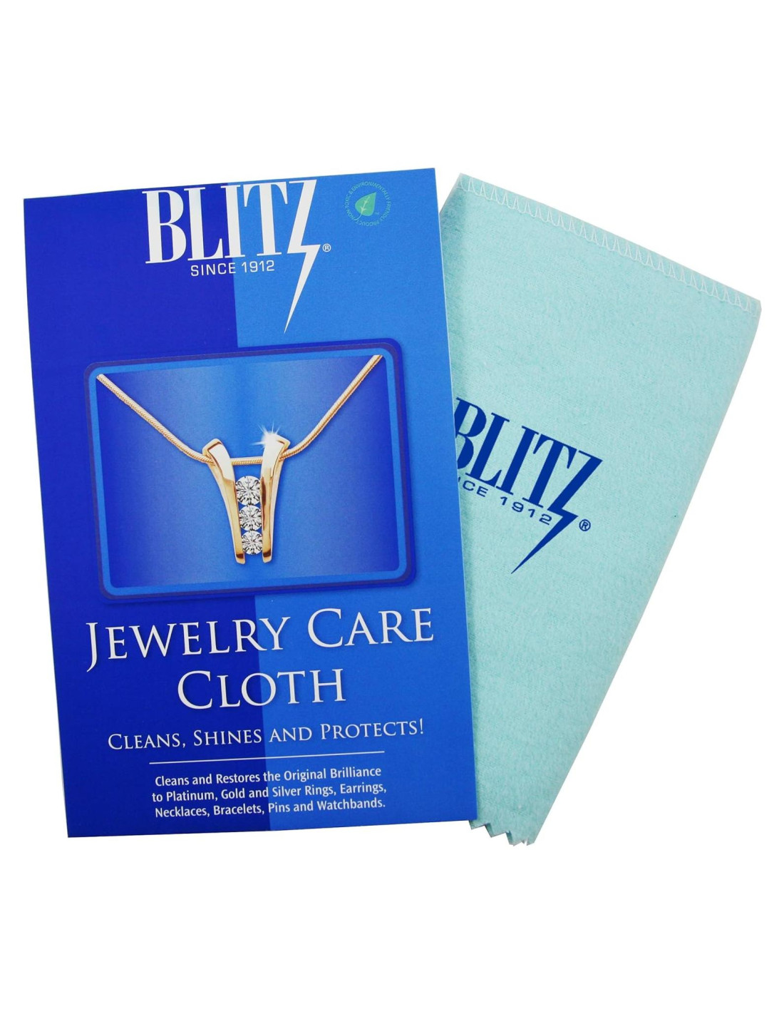 Blitz 117 Limpia, Brilla y Protege joyería de oro, plata y platino. El Paño de Cuidado de Joyería Premium Blitz tiene un interior de franela de algodón 100% tratado para eliminar el deslustre. Un paño exterior de pulido para dar brillo a la joyería. El pulidor en el paño contiene inhibidor de deslustre Blitz para mantener la joyería luciendo nueva por más tiempo. Desde 1912 Blitz ha fabricado paños de pulido de alta calidad en EE. UU. para profesionales de la joyería y consumidores por igual. El Paño de Cuidado de Joyería Blitz está hecho de 100% algodón de franela y tratado con los mejores ingredientes ecológicos. El paño no contiene productos químicos agresivos ni abrasivos. El Paño de Cuidado de Joyería Blitz es extra grande permitiendo la máxima cantidad de joyería a limpiar así como siendo conveniente para piezas más grandes. El paño de cuidado Blitz se puede usar de manera segura para pulir monedas, instrumentos musicales de metal fino y muchos otros metales domésticos ligeramente deslustres. Para plata muy deslustre y superficies grandes usar Blitz Silver Shine Liquid Polish. No usar en joyería de delgada capa, plata bañada en rodio o lacada. No usar en piedras suaves o porosas. Todos los paños de pulido se miden abiertos y planos.