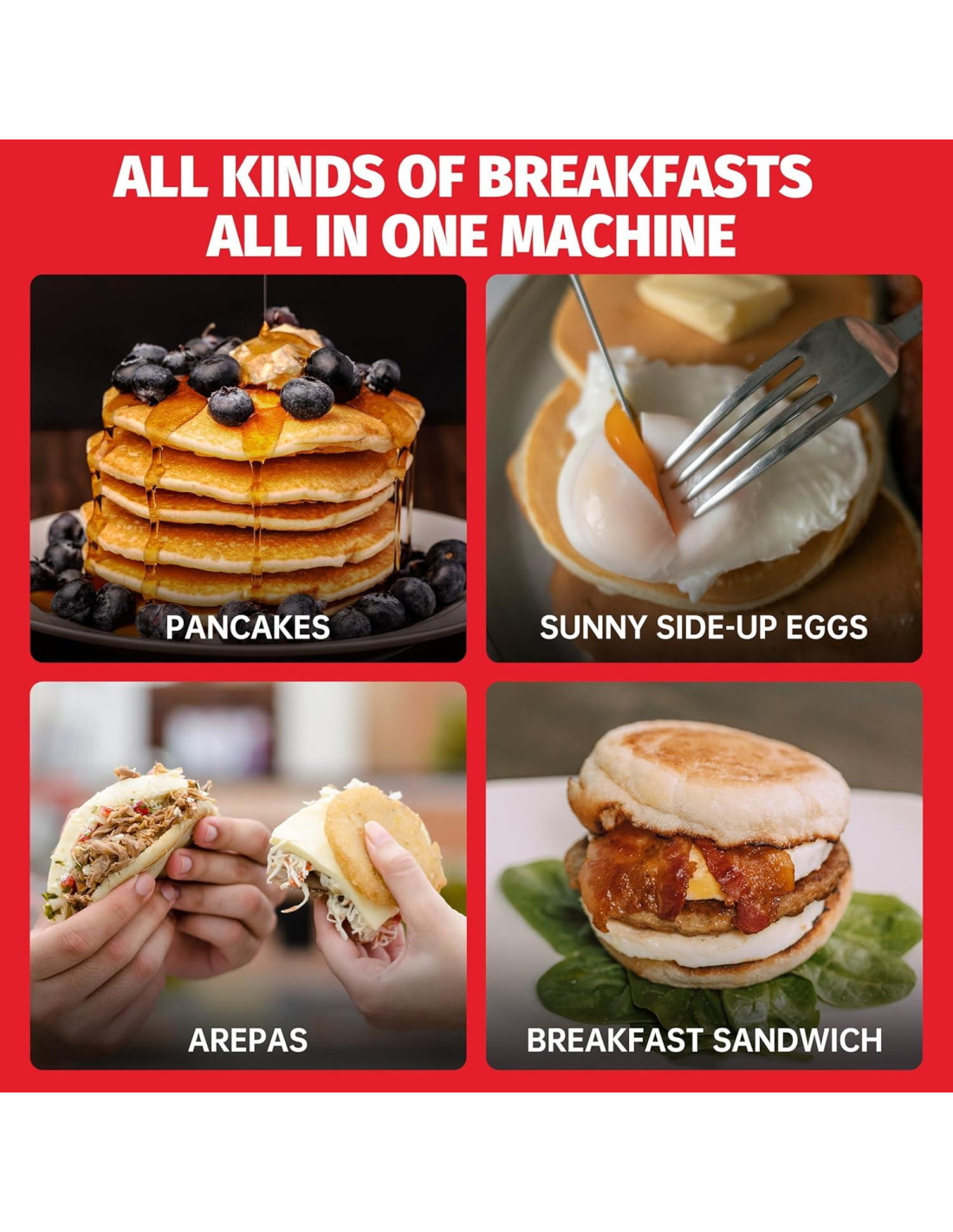 - [MÁS ALLÁ DE LOS PANQUEQUES]: Prepara porciones individuales/familiares de huevos, galletas, panqueques y queso a la parrilla sin necesidad de numerosas ollas y sartenes.