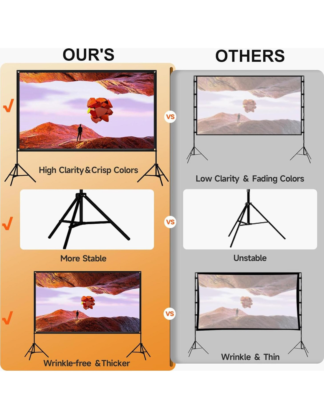 - - Diseño de soportes de trípode ultra-estables - El soporte de montaje de esta pantalla de cine al aire libre está diseñado con tubos de aleación de aluminio roscados, que crean un marco más seguro y estable. La base del trípode de 65 cm (25.6 pulgadas) ofrece un 30% más de estabilidad que otros artículos estándar. Usando estacas para el suelo y cuerdas para el viento, puede mantenerse firme en condiciones de viento y al aire libre. Construido para durar, puede resistir los elementos, ofreciendo estabilidad mejorada y rendimiento confiable en diversas configuraciones.