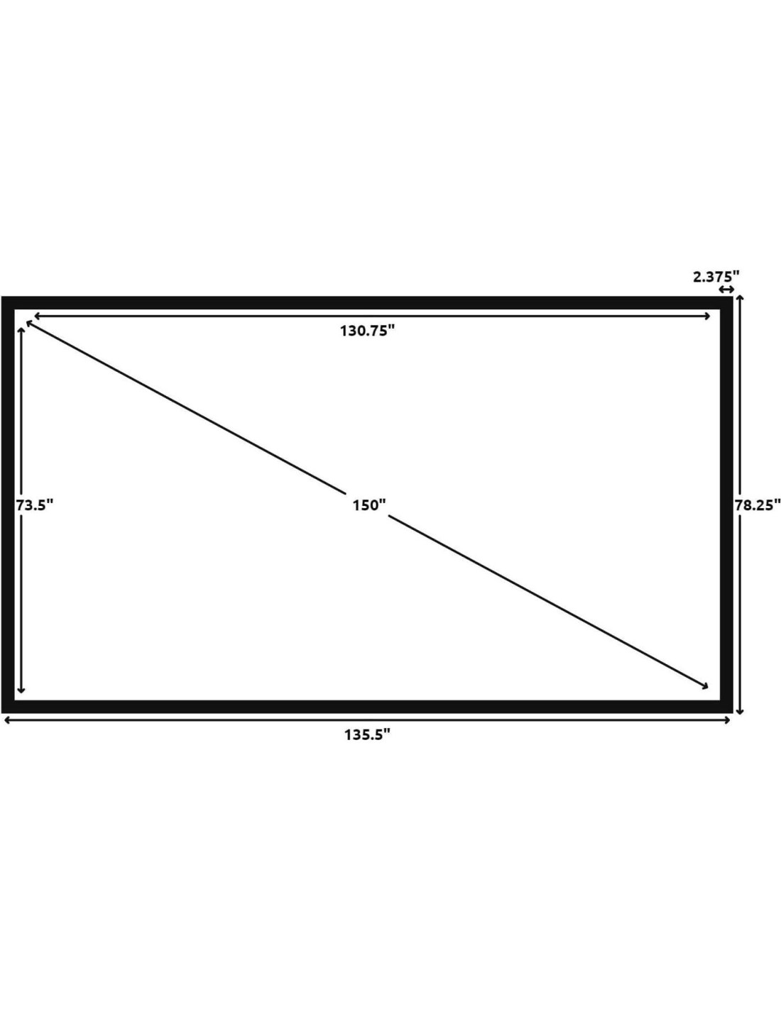 - Pantalla de proyección de marco fijo montada en la pared (Tamaño total 78.25" (198,12 cm) de alto x 135.5" (344,38 cm) de ancho) (Área de visualización 150" (381 cm) diagonal x 73.5" (186,69 cm) de alto x 130.75" (332,67 cm) de ancho) Sin opción de patas o soportes con este producto. Recomendado para proyectores con resolución nativa 16:9